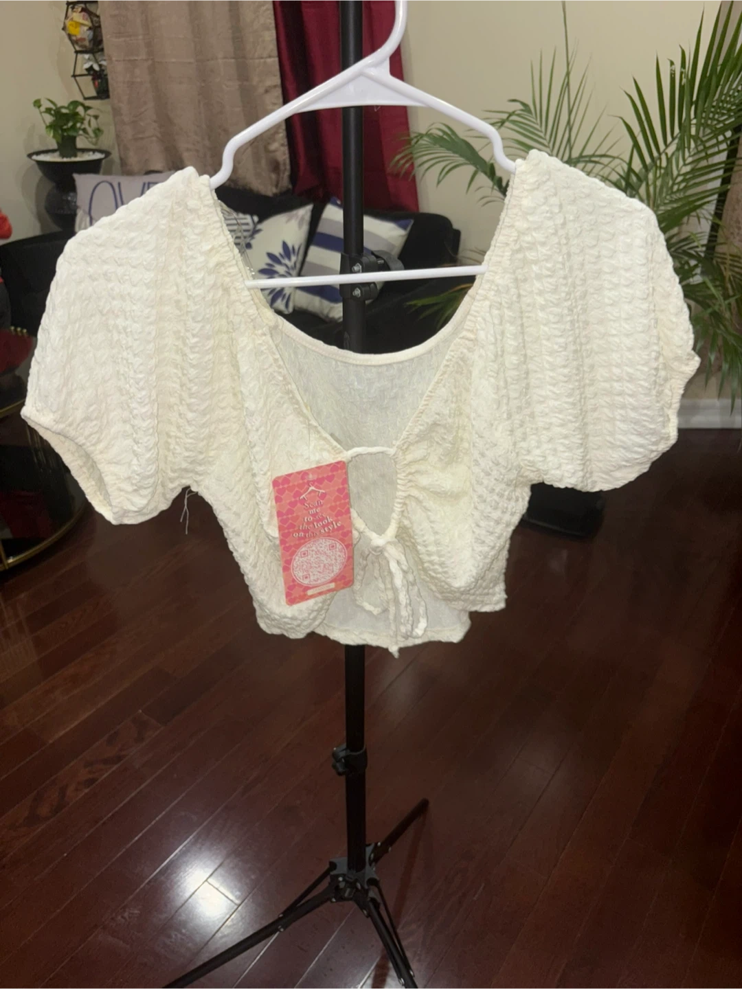 Here's a cute cream-colored textured crop top! It has a tie-front detail and short sleeves. Perfect for adding a touch of style to your wardrobe