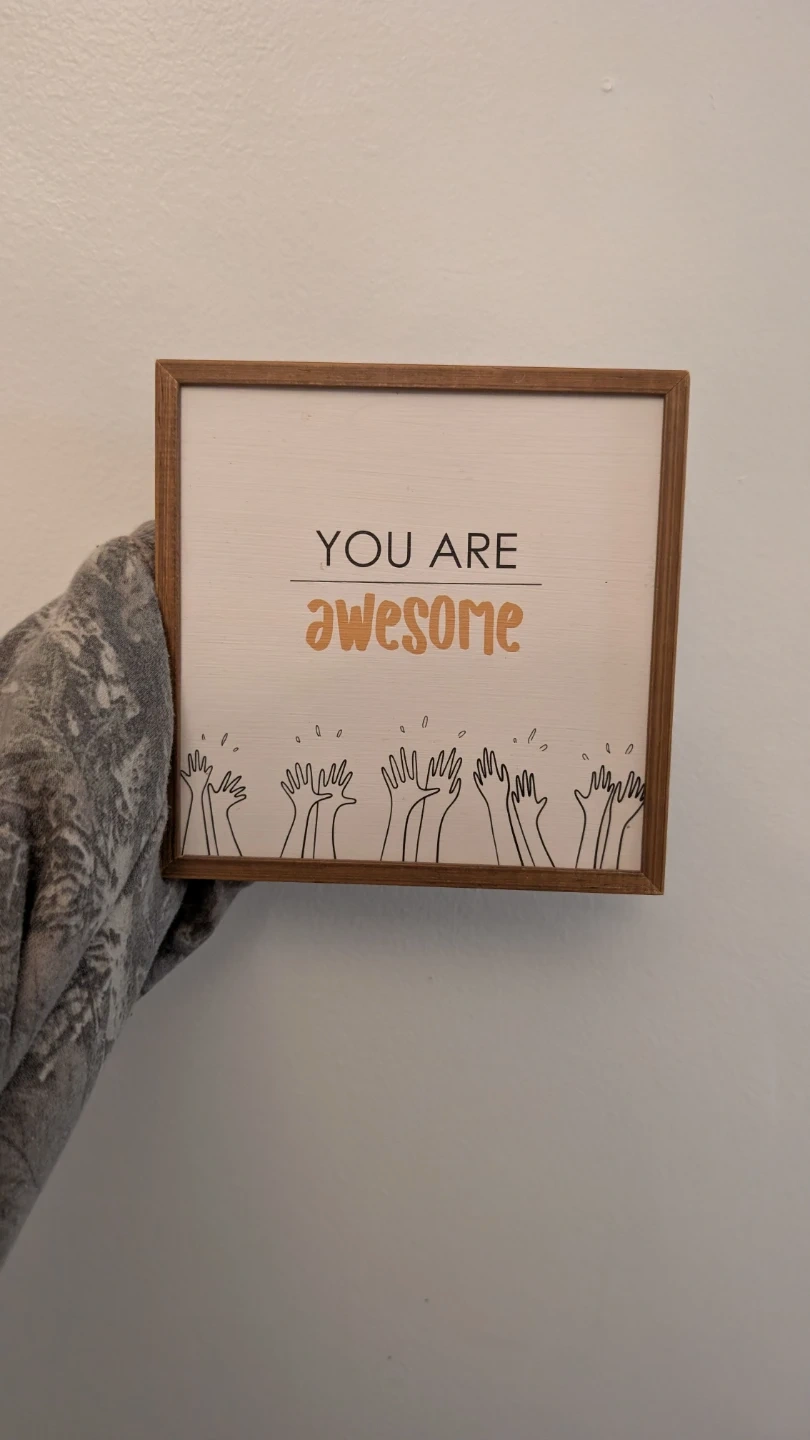 A cute framed piece of wall art that reads 'You Are Awesome' with a simple design of hands reaching up. Perfect for adding a bit of positivity to any room!