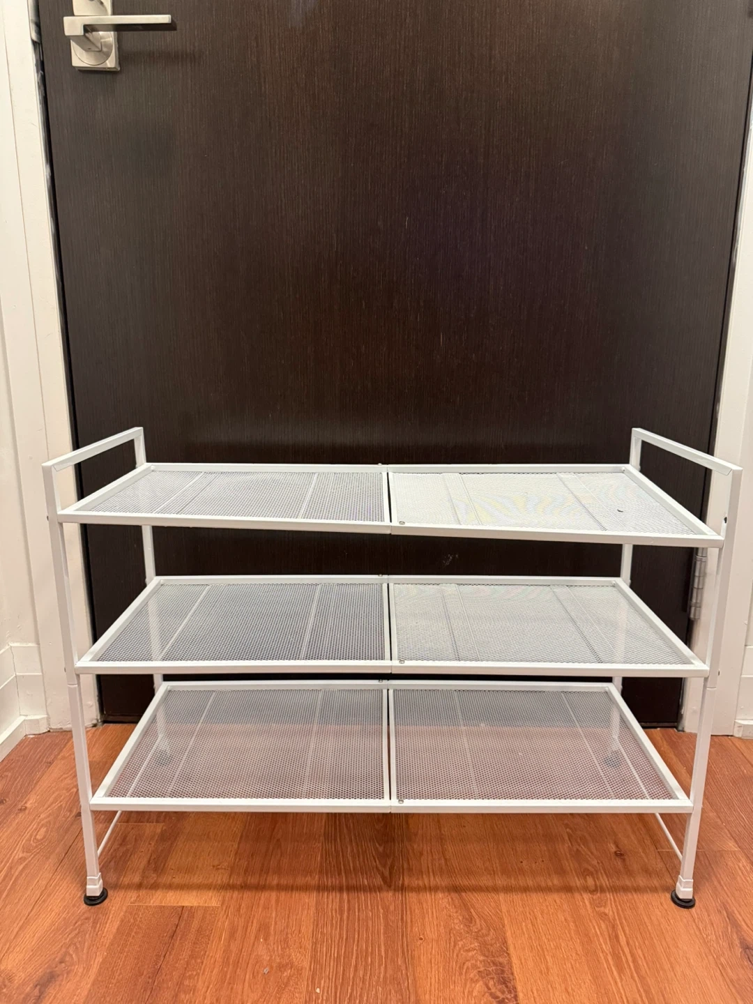 Here's a handy white metal shoe rack with three tiers! It's perfect for keeping your entryway or closet organized. It's in great shape and ready to hold all your footwear.