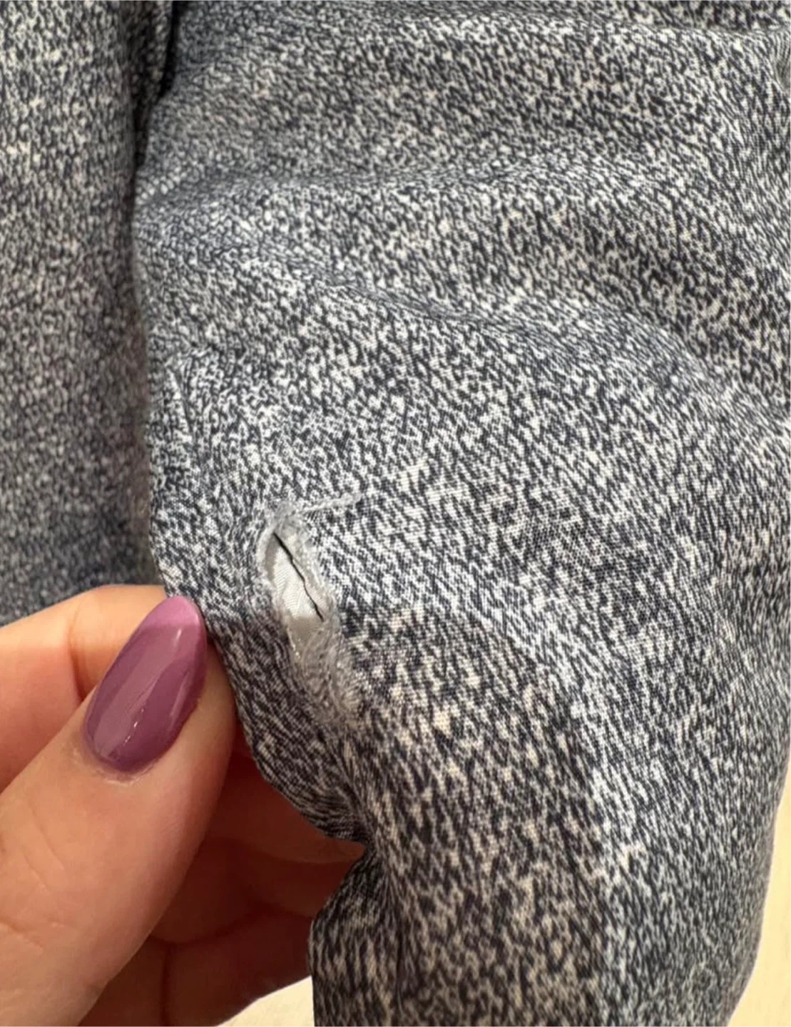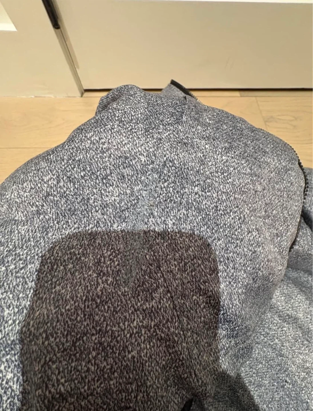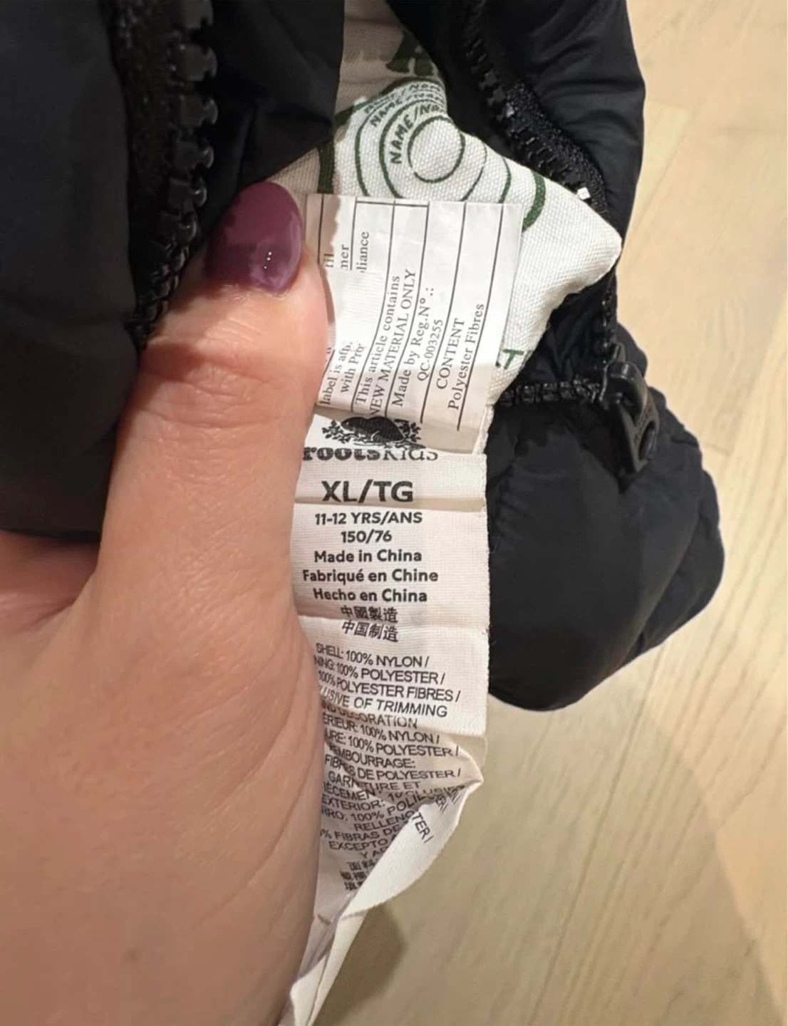 Roots Kids reversible puffer jacket in size XL (11-12 years). It's grey on one side and black on the other. There is a small tear on the grey side that can be sewn.There was another tear near pocket of grey side but that was sewn shown in photo #3.