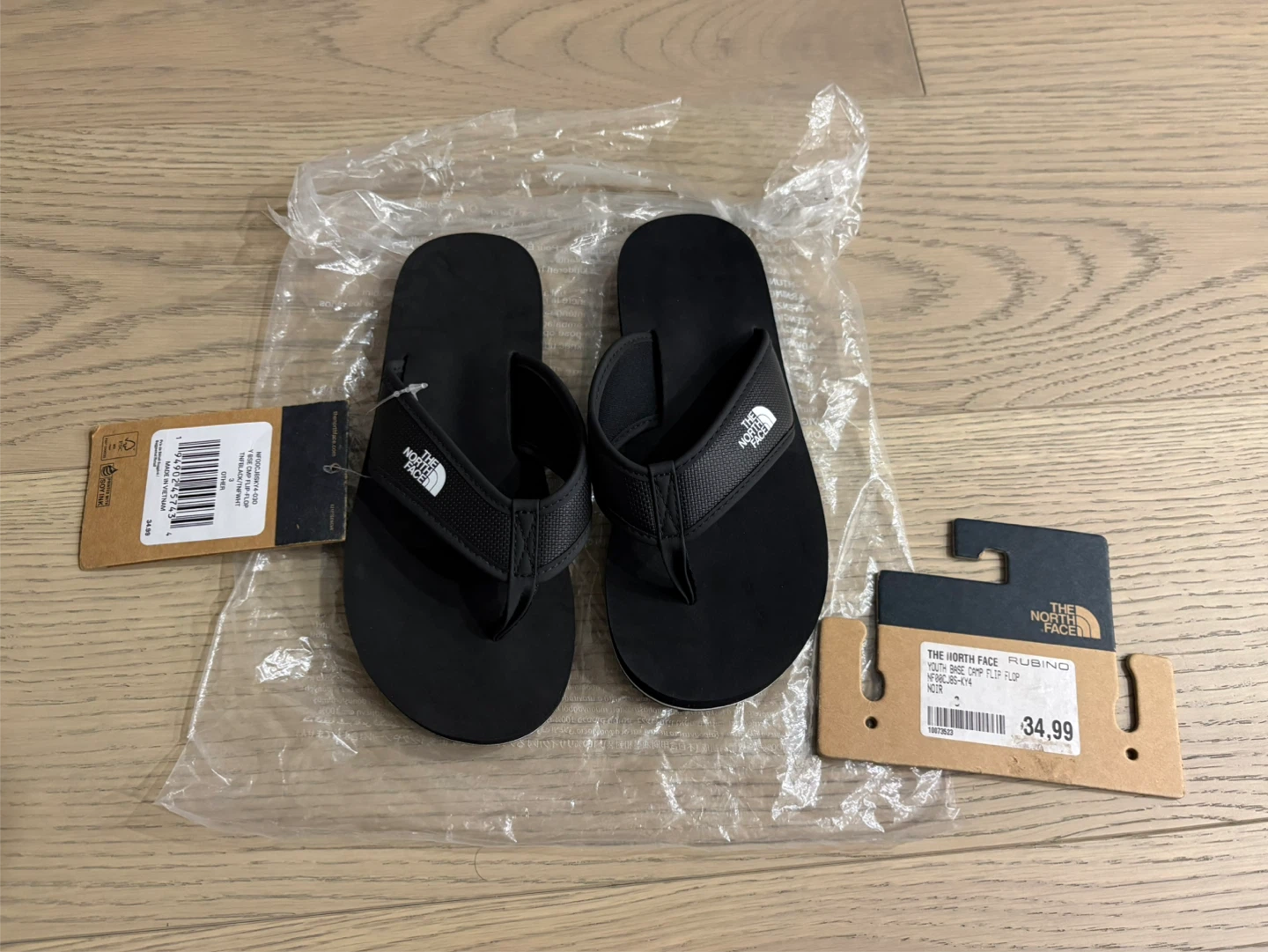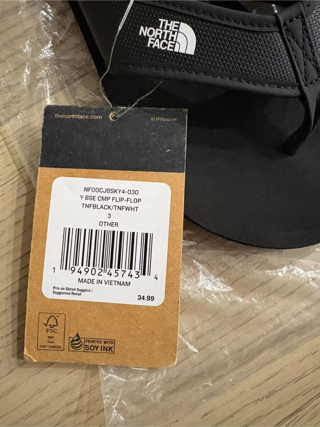 Selling a brand new pair of The North Face Base Camp flip-flops in TNF Black! These are size 3. The original retail price was $34.99