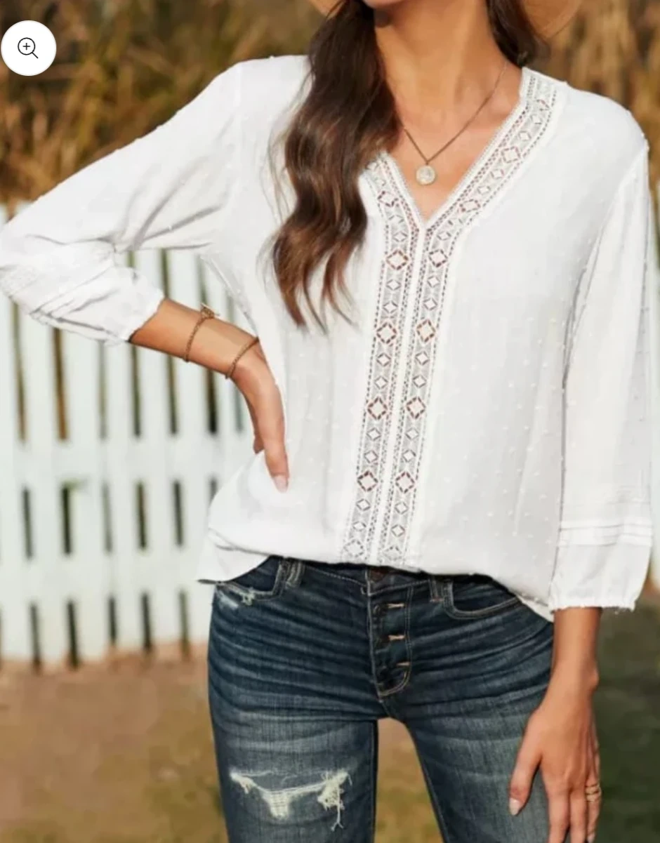 A lovely white blouse with a V-neck design. It features a delicate pattern down the front. Perfect for a casual or dressed-up look!
