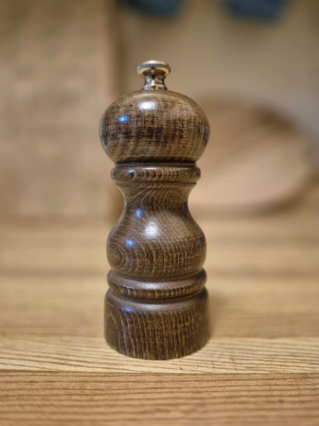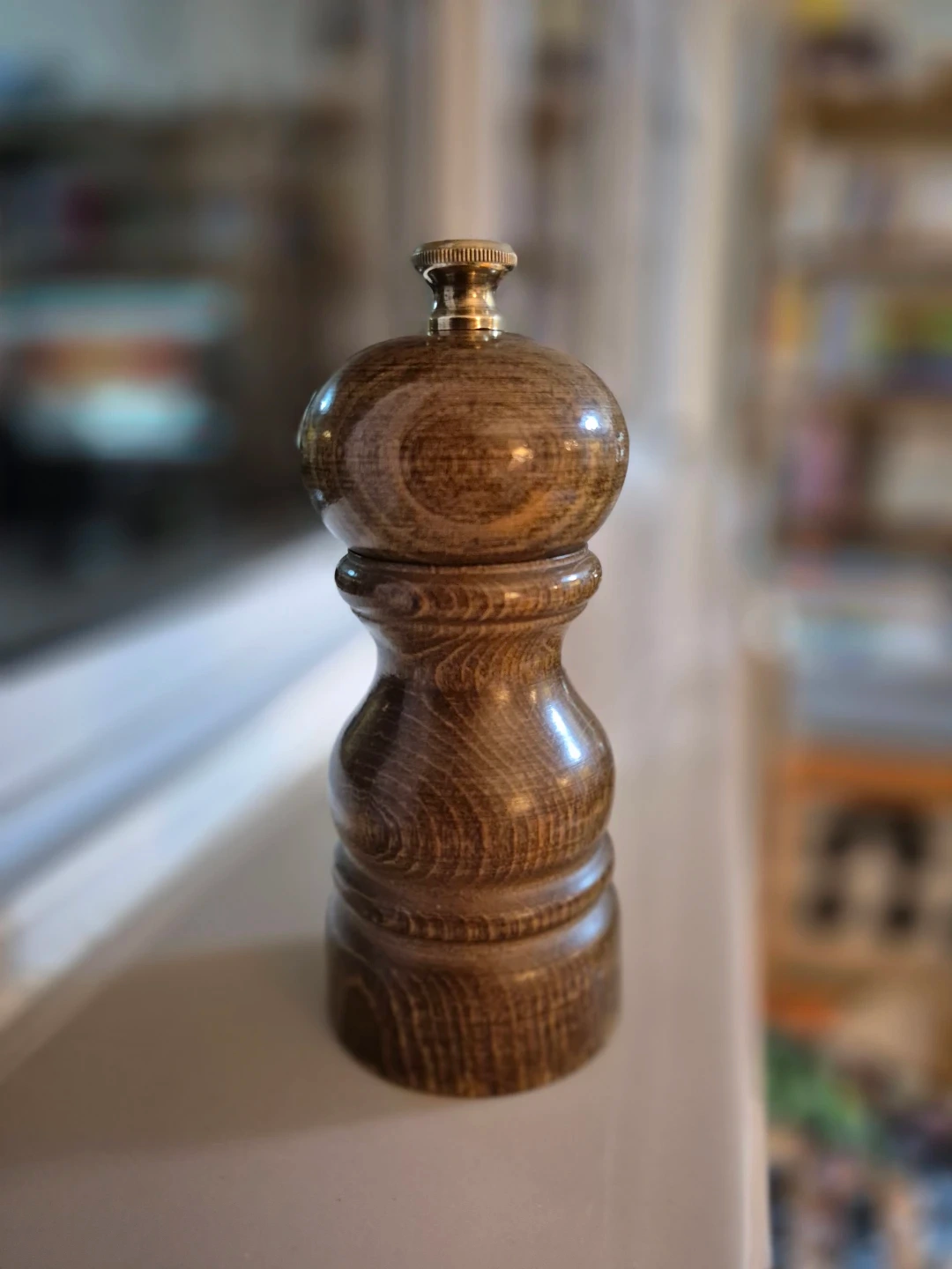 These are the Rolls Royce of pepper grinders, and this one is a particularly lovely one, made of oak with a brass knob. The size and sculpted shape fit so perfectly in the hand, the big knob is easy to grip and turn, and it has the smoothest mechanism I've ever used. Bought in the early 1990's (they use cheaper woods now) and it works every bit as well today! It hasn't actually been used a ton, and is in wonderful condition.