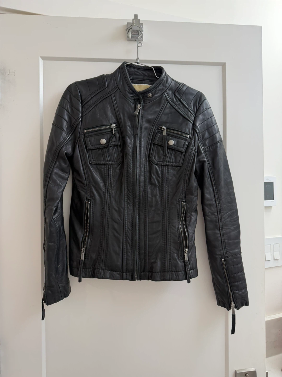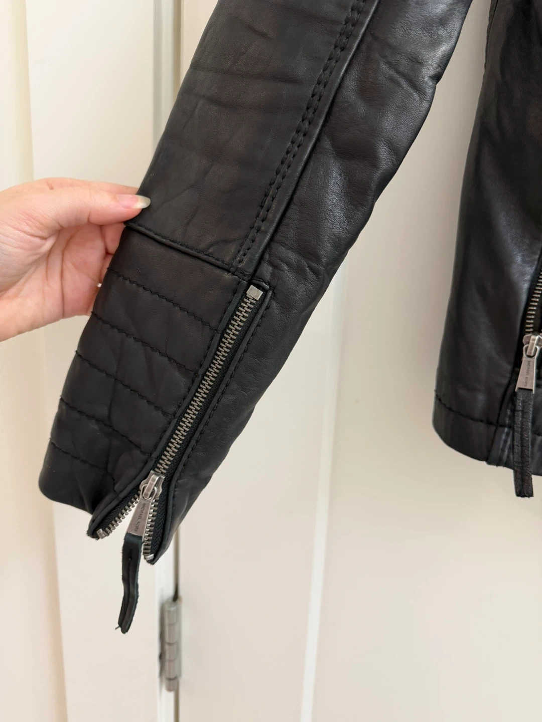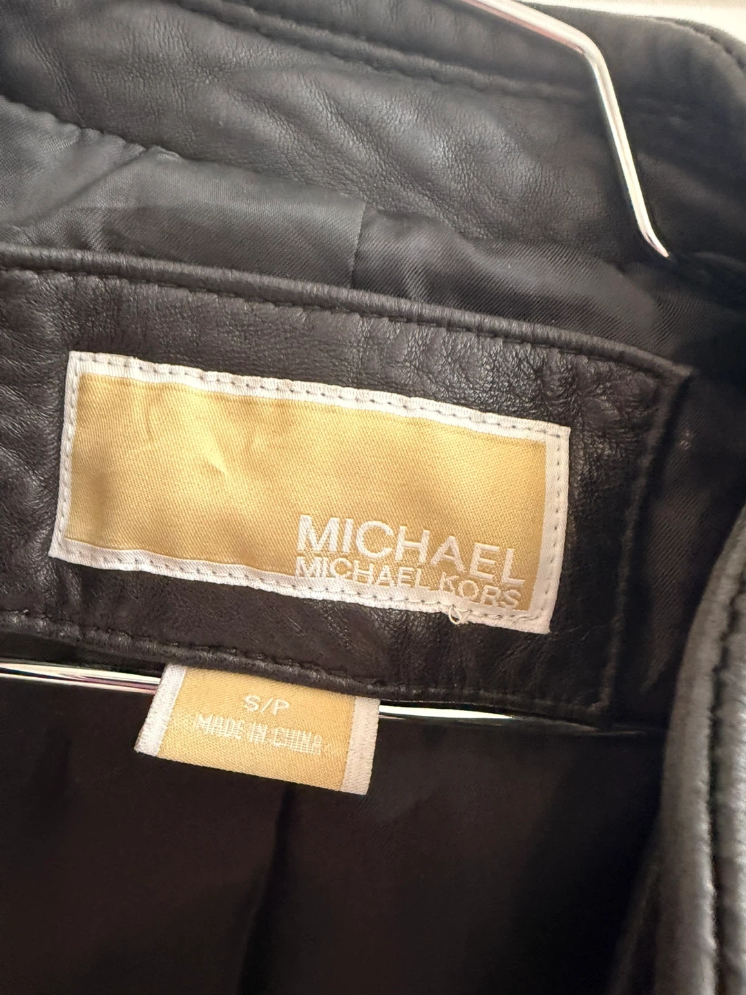 Selling a stylish Michael Kors black leather jacket in size S/P. The shell is 100% leather and the lining is 100% polyester. It's in great condition and ready for a new owner!