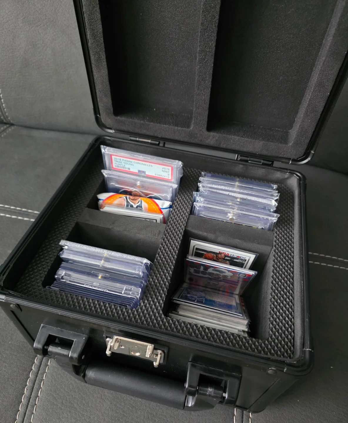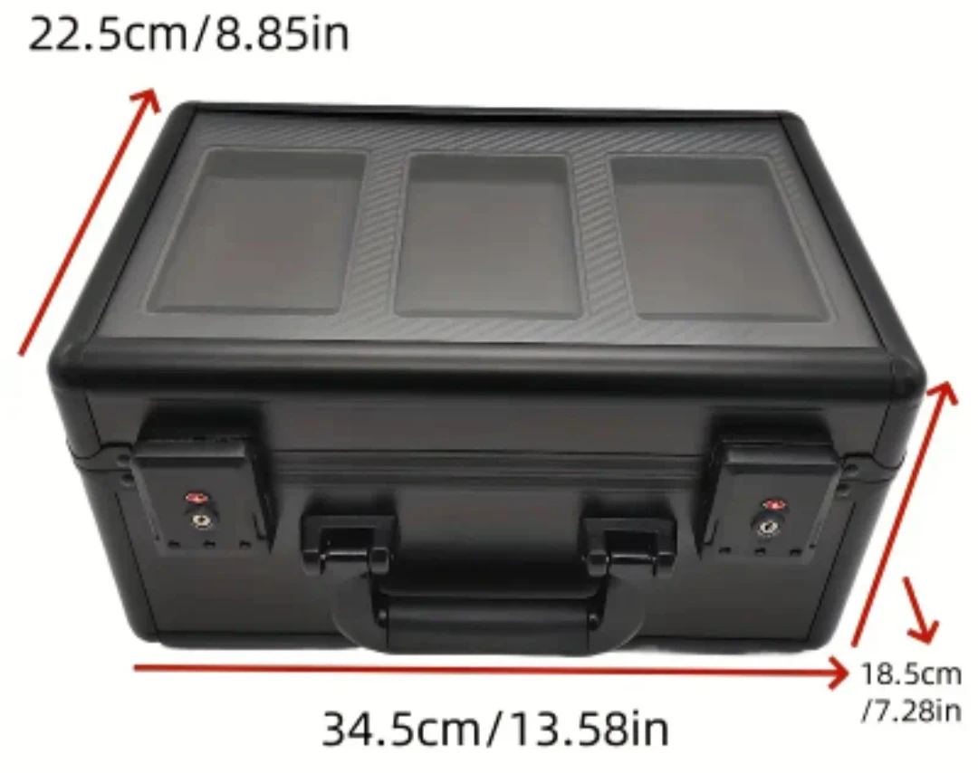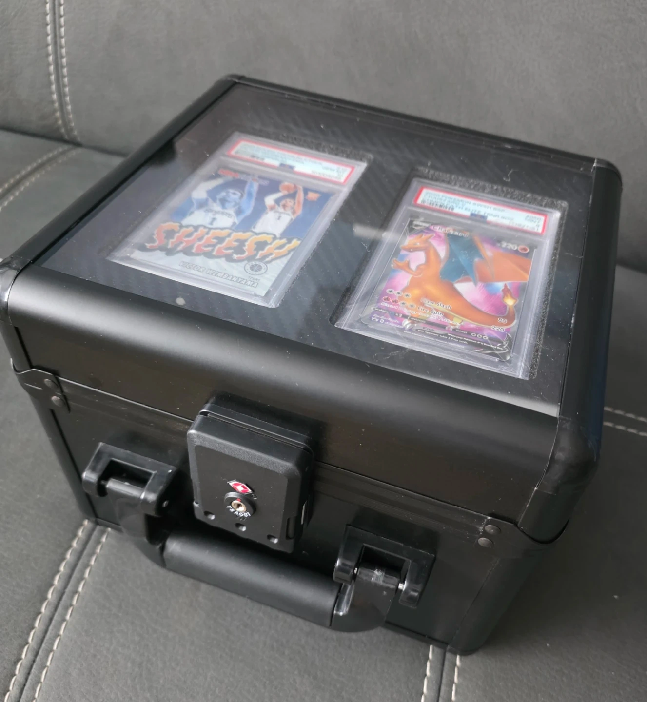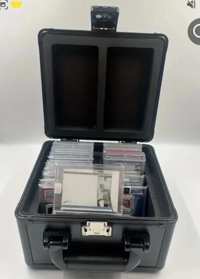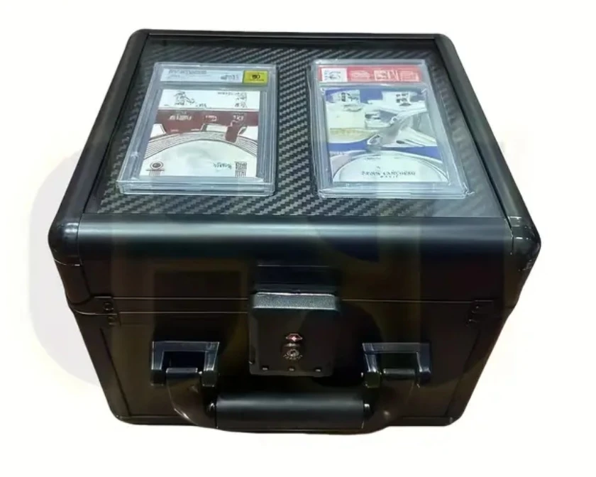 Selling a black trading card case, perfect for storing and protecting your valuable cards. It has a secure lock and a handle for easy carrying. Inside, there are compartments designed to hold graded cards and packs. Great for collectors!
