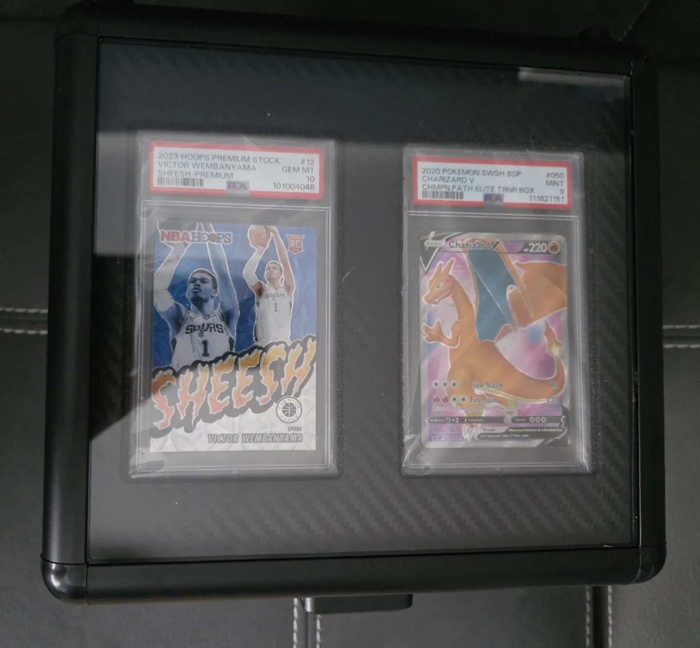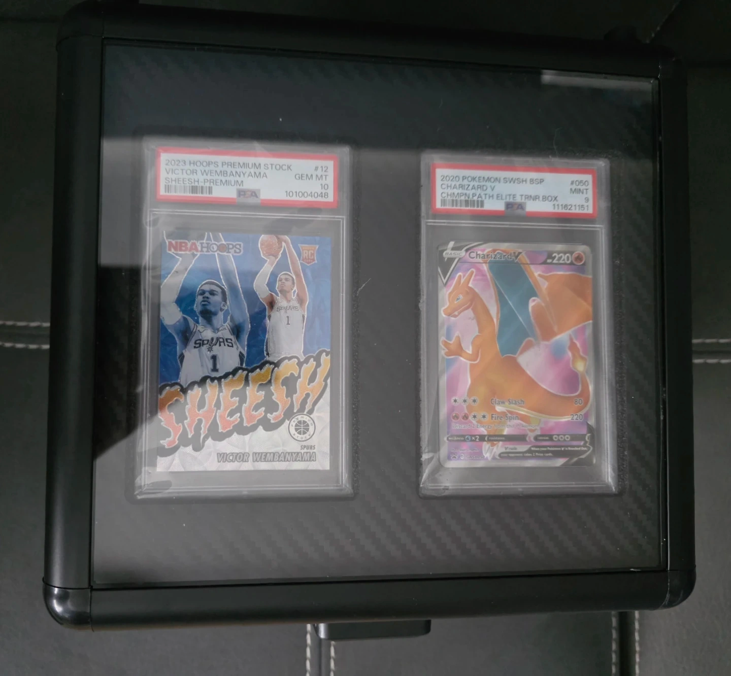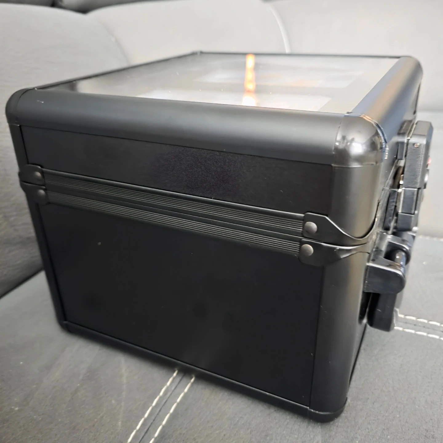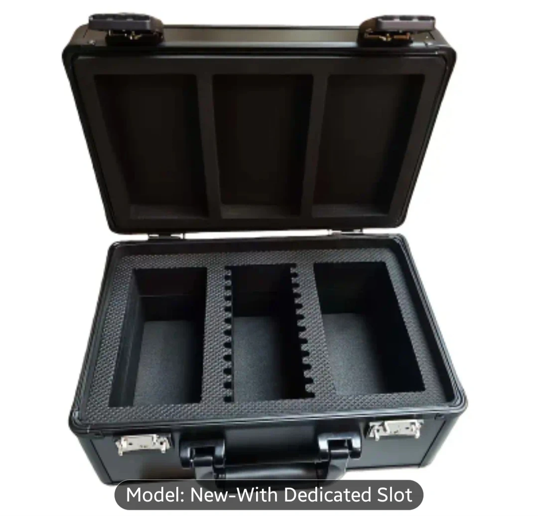 Selling a black trading card case, perfect for storing and protecting your valuable cards. It has a secure lock and a handle for easy carrying. Inside, there are compartments designed to hold graded cards and packs. Great for collectors!