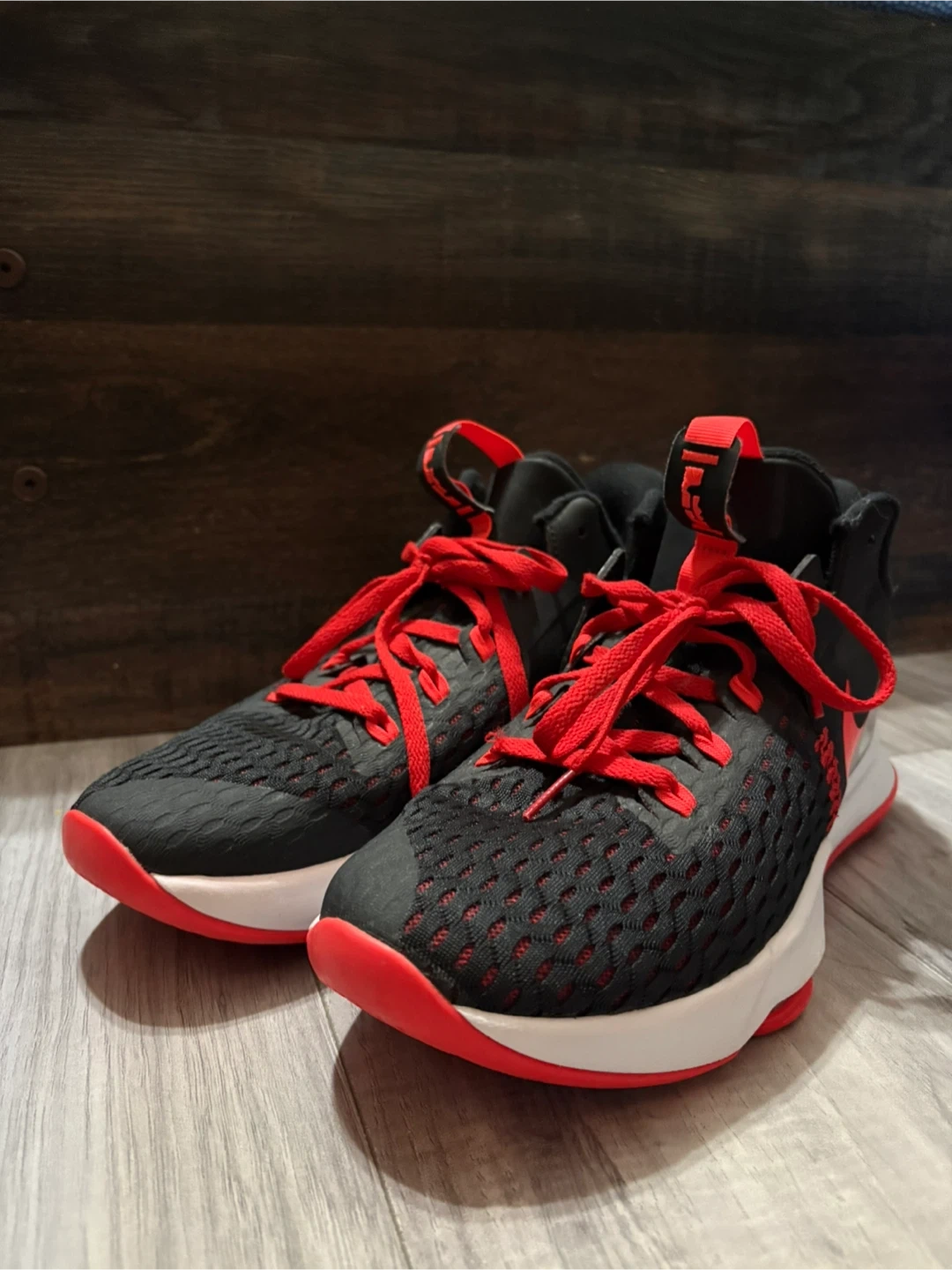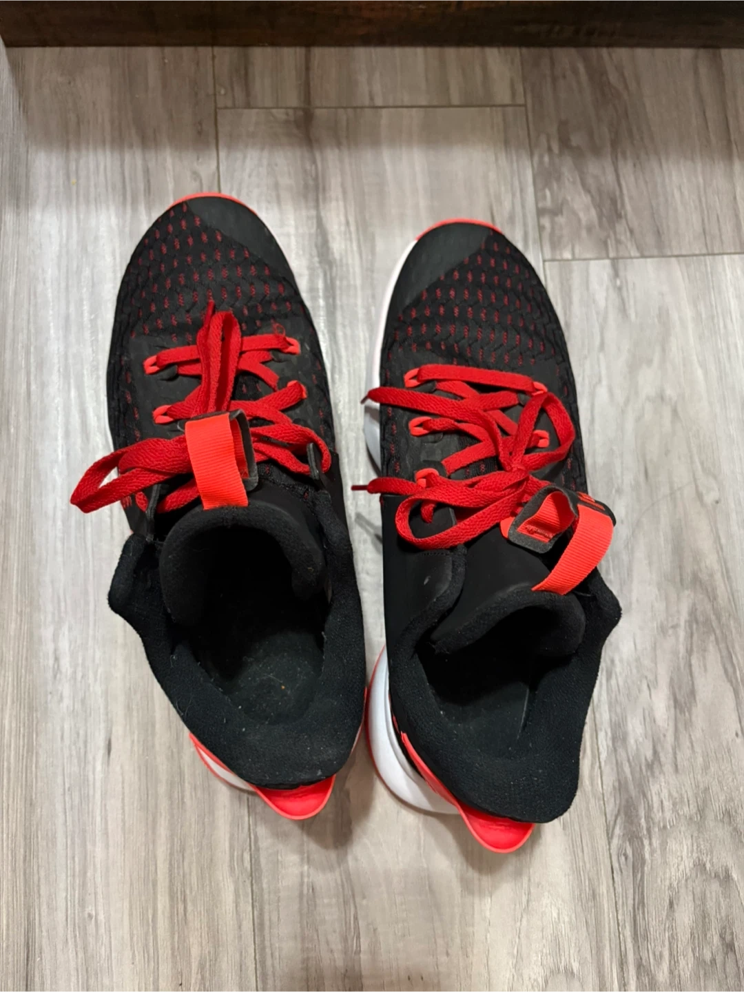 Selling a pair of basketball shoes in US size 10.5. They feature a stylish black and crimson colour scheme, not entirely fresh out the box but has only be worn 3 times and has been collecting dust waiting for someone.