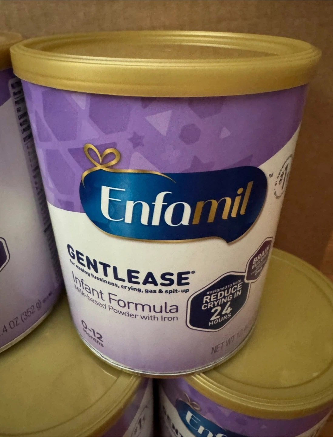 Selling 4 cans Enfamil Gentlease Infant Formula, perfect for babies aged 0-12 months. It's designed to help reduce crying in 24 hours and ease fussiness, crying, gas, and spit-up. This milk-based powder also contains iron