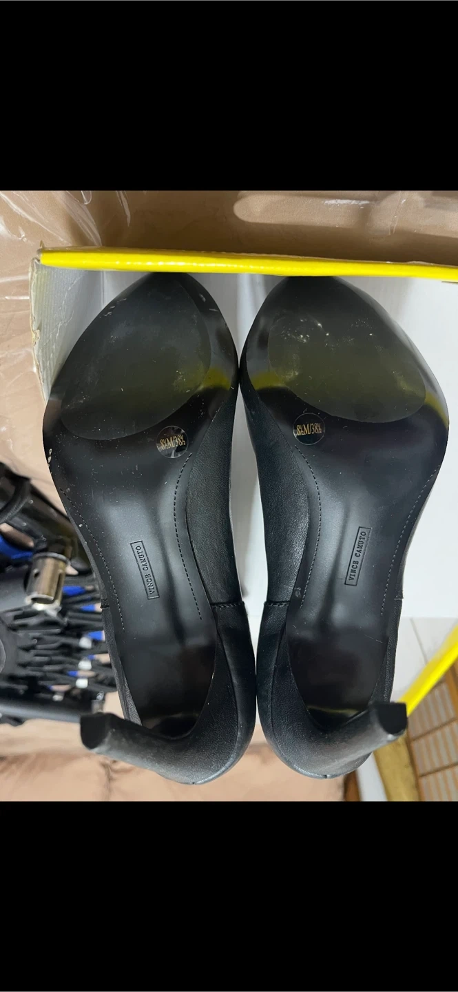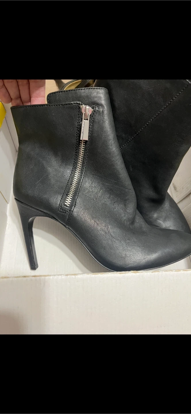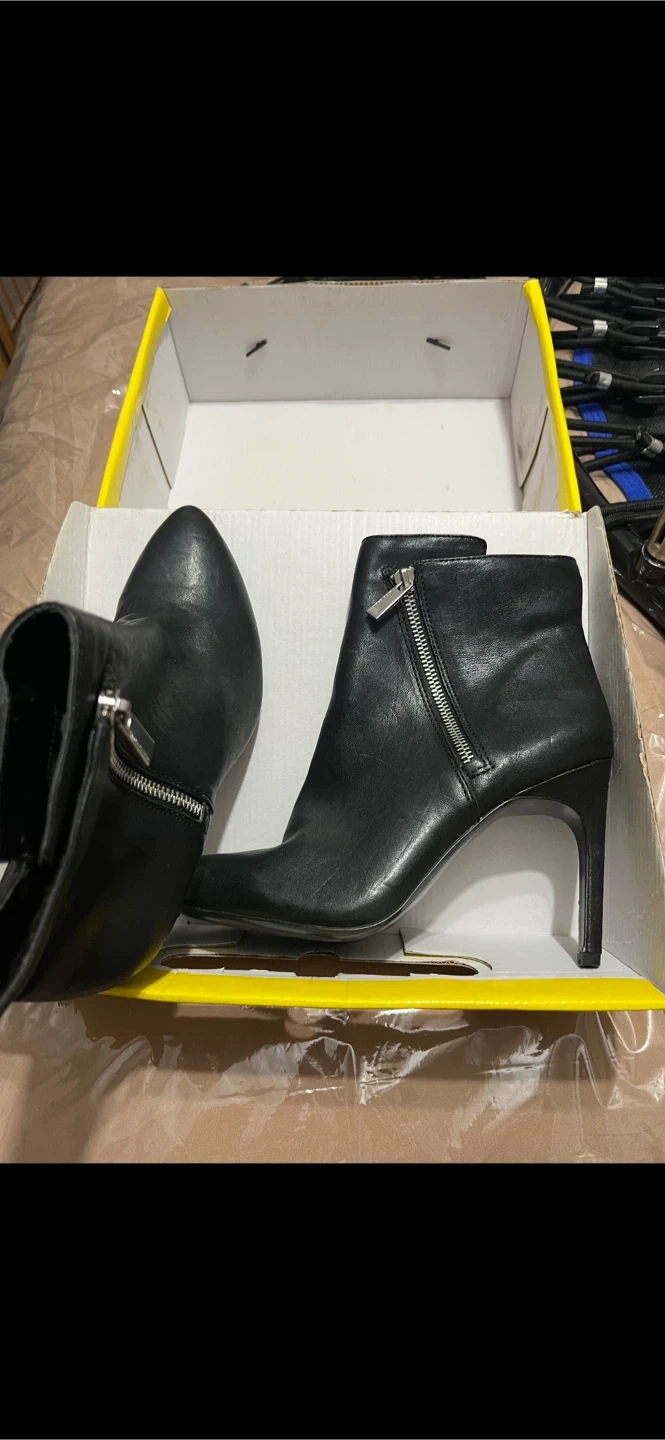 - Vince Camuto- Black Leather booties in size 8 M 4” heel. They feature a stylish zipper detail on the side. W/O the original box. $50.