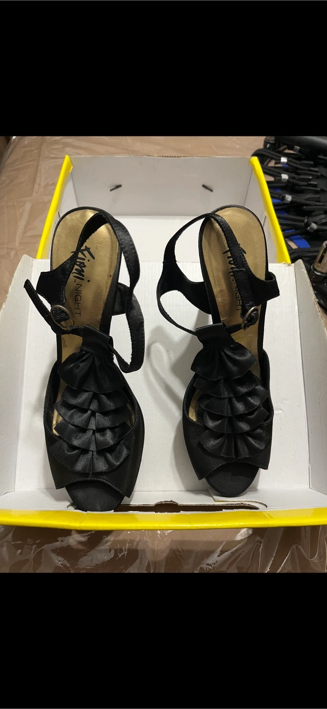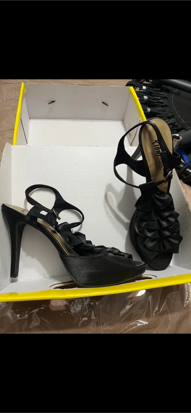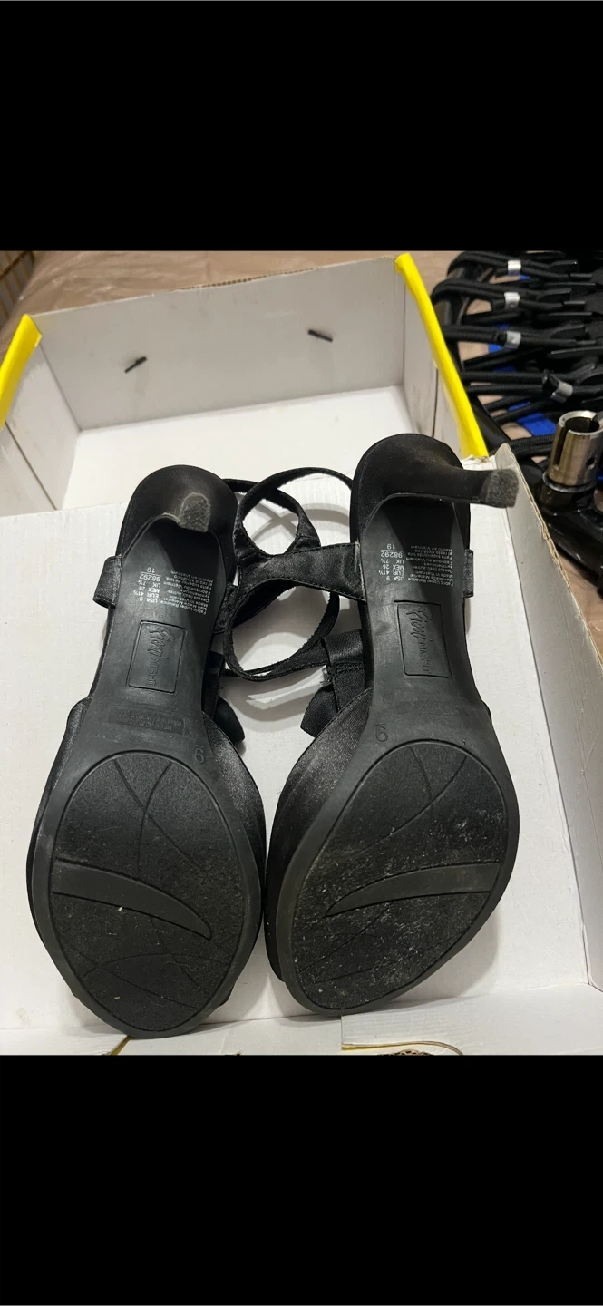 - Fiony Black satin dress Sandals size 9, 4". $20. GOOD