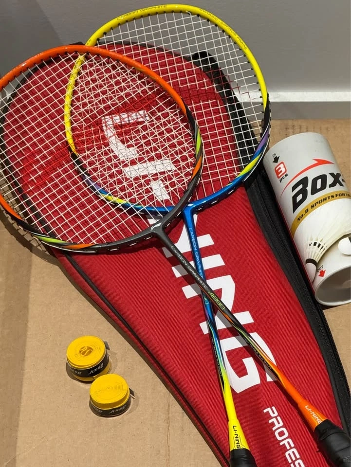 Complete badminton set for sale, perfect for intermediate or recreational players. Includes: 2 Li-Ning Carbon Graphite rackets, 1 carrying bag, a tube of 3 shuttlecocks, and 2 rolls of new overgrip (yellow).