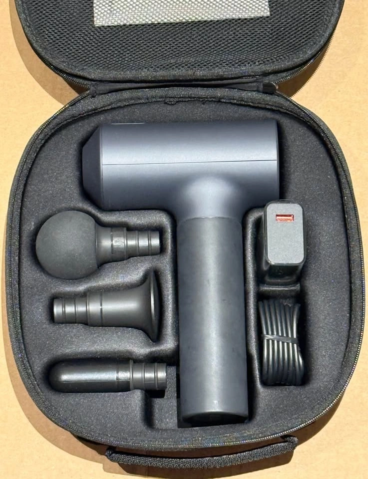Deep tissue massage gun to help with muscle recovery and soreness relief. Features: 3 different massage heads (ball, flat, bullet), charging brick, and USB cable included.