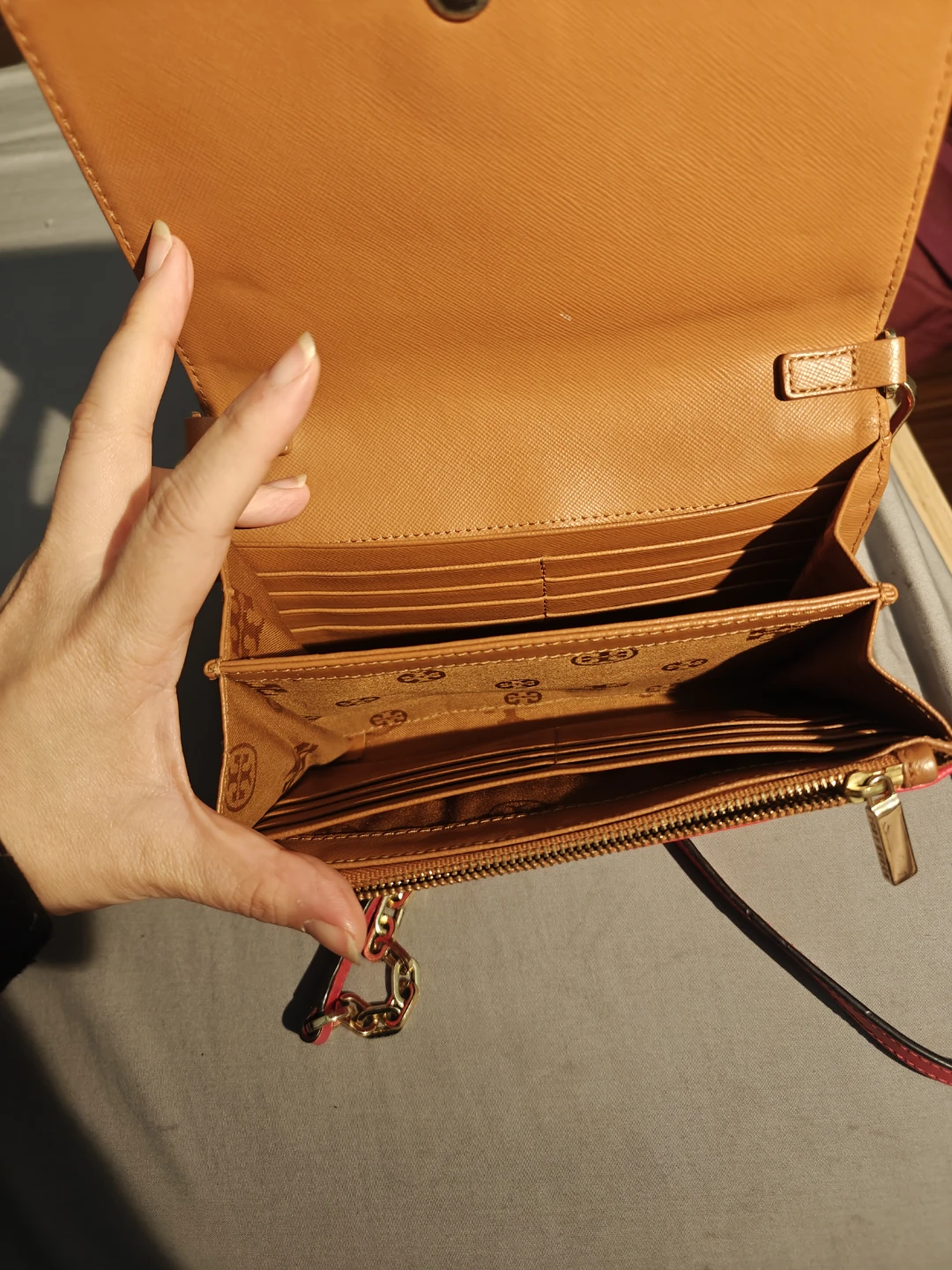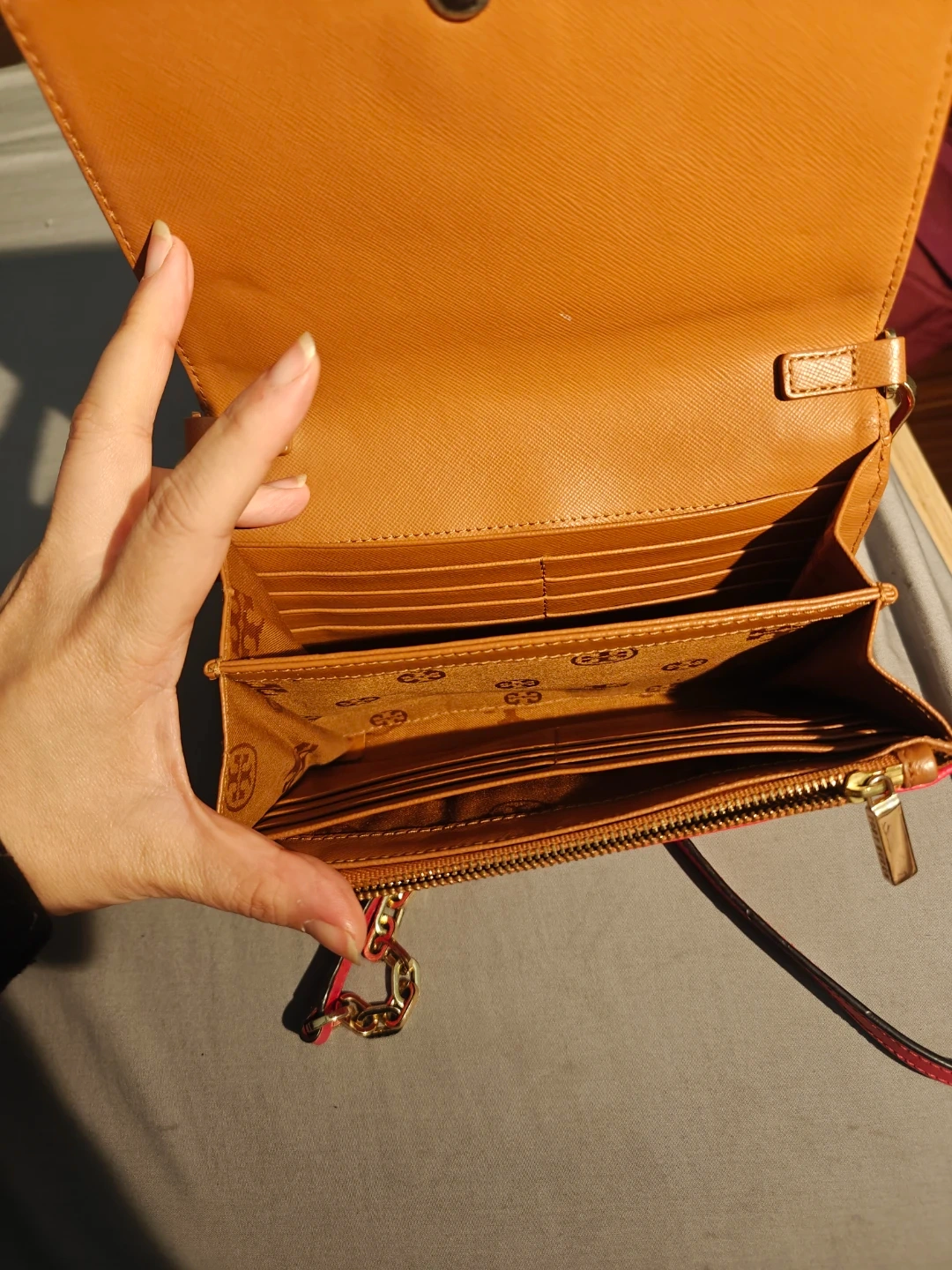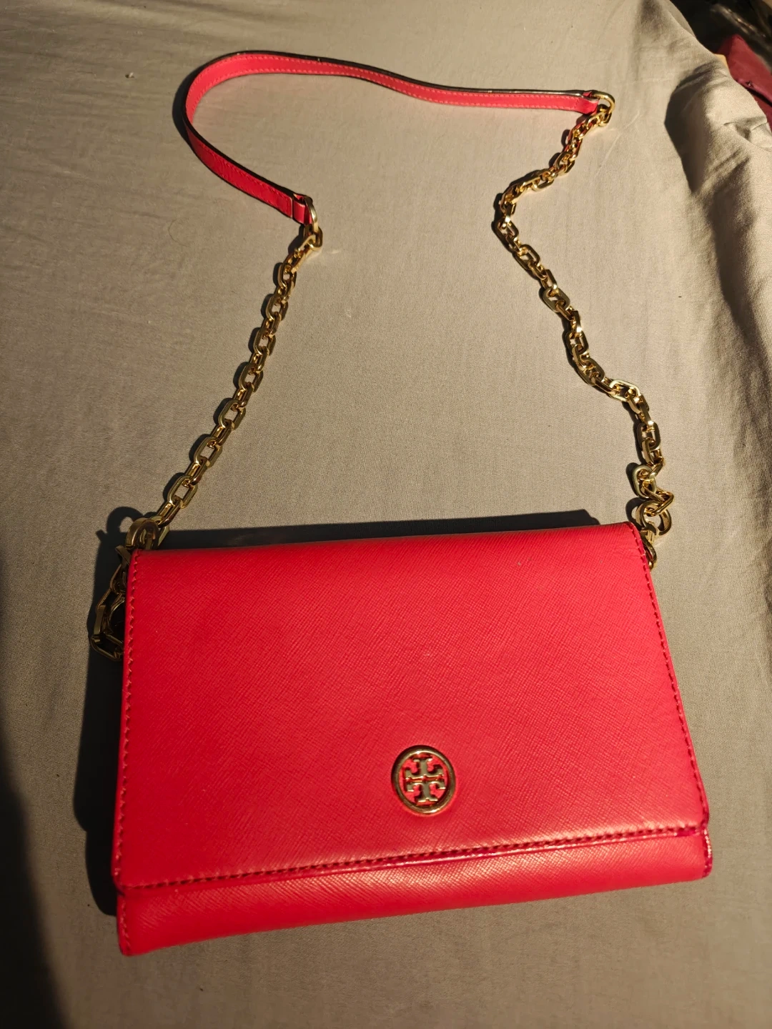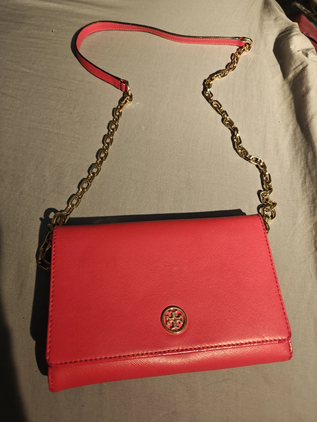 This Tory Burch crossbody wallet is in great condition! It features a vibrant pink leather exterior with a gold-tone logo and chain strap. The interior has several card slots and compartments to keep you organized. Perfect for everyday use or a night out!