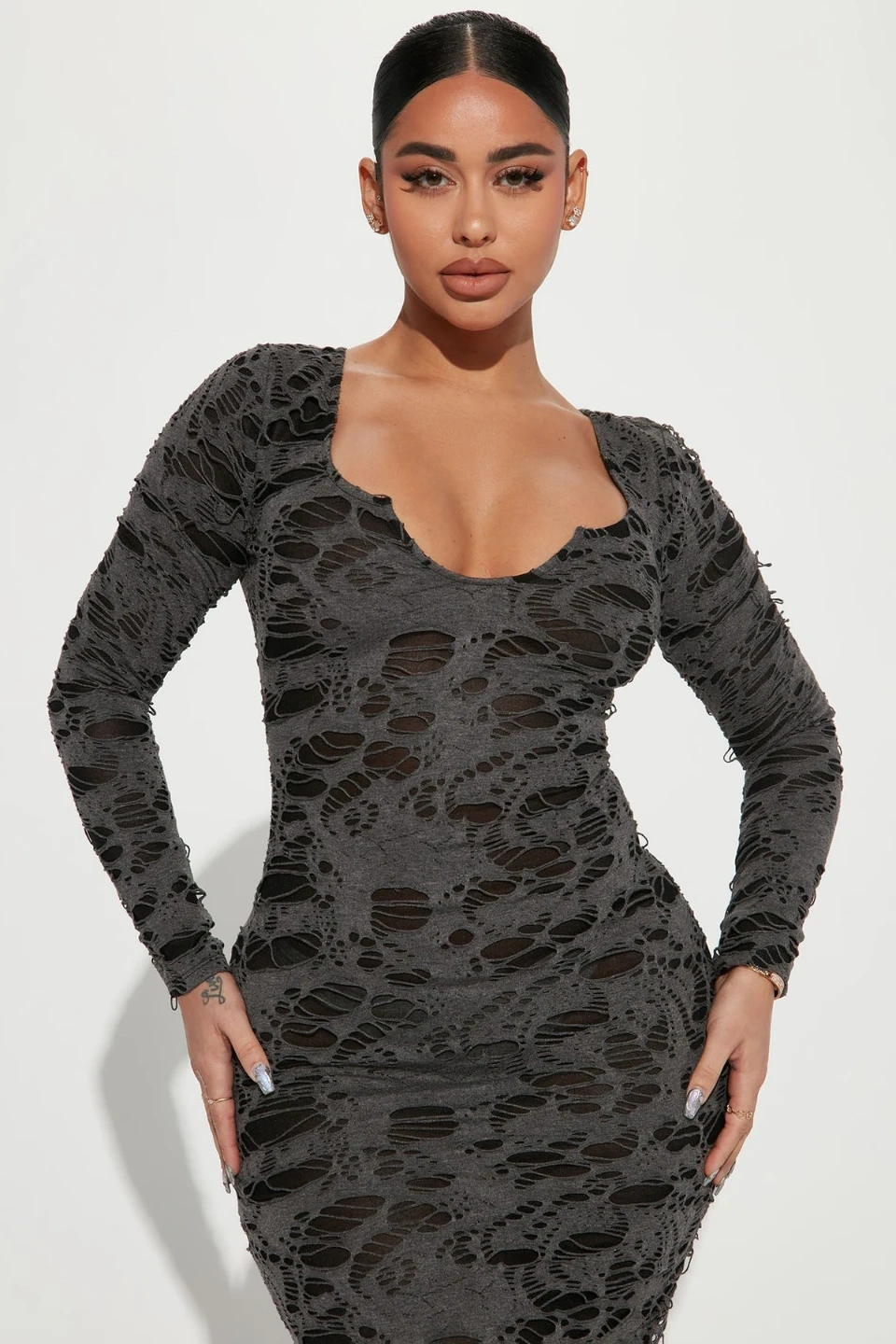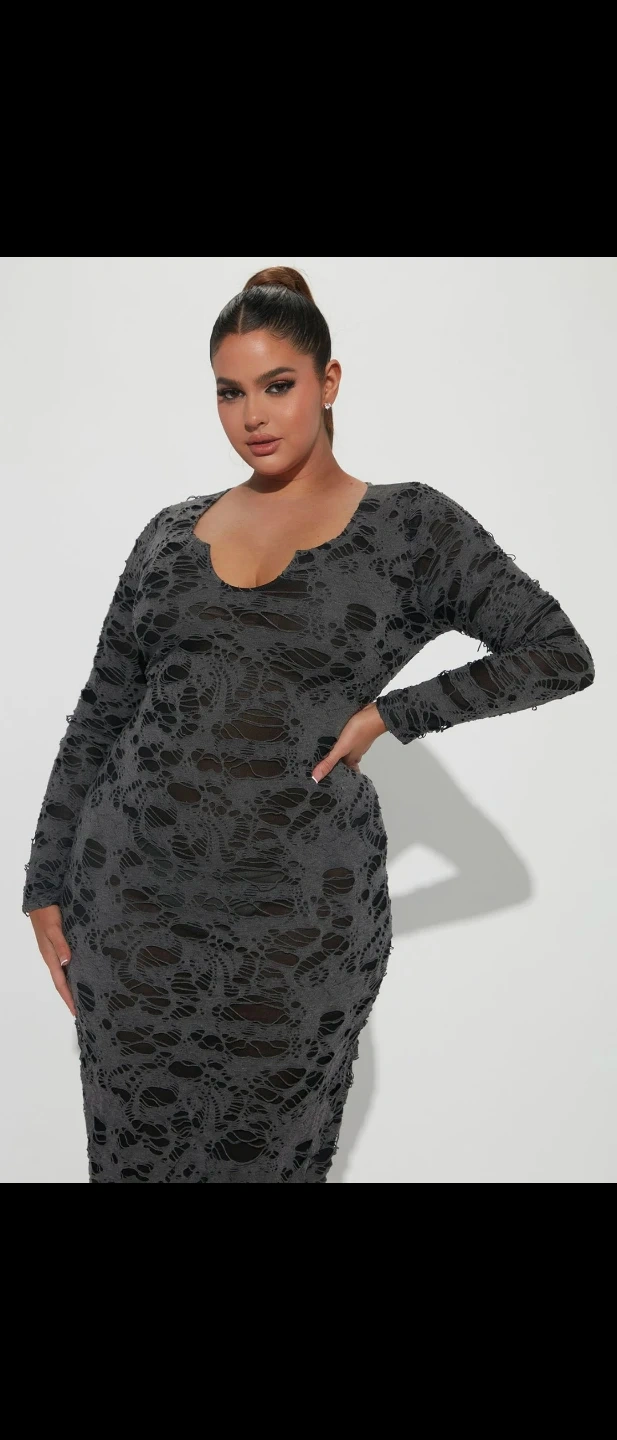 This Fashion Nova long sleeve dress features a unique distressed design. It has a scoop neckline and a form-fitting silhouette. The dress is offering both style and comfort. Perfect for a night out or a special occasion.