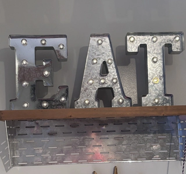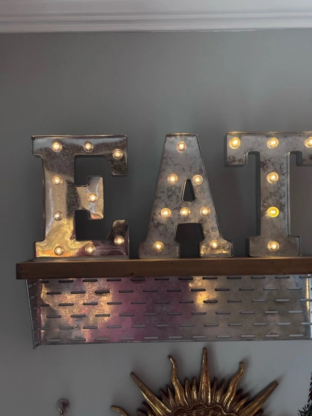 Galvanized light up Marquee style letters atop a metal and wood wall mounted shelf. Each letter requires two AA batteries. The shelf measures 7” x 24”. Each letter is 10” high. Perfect condition.