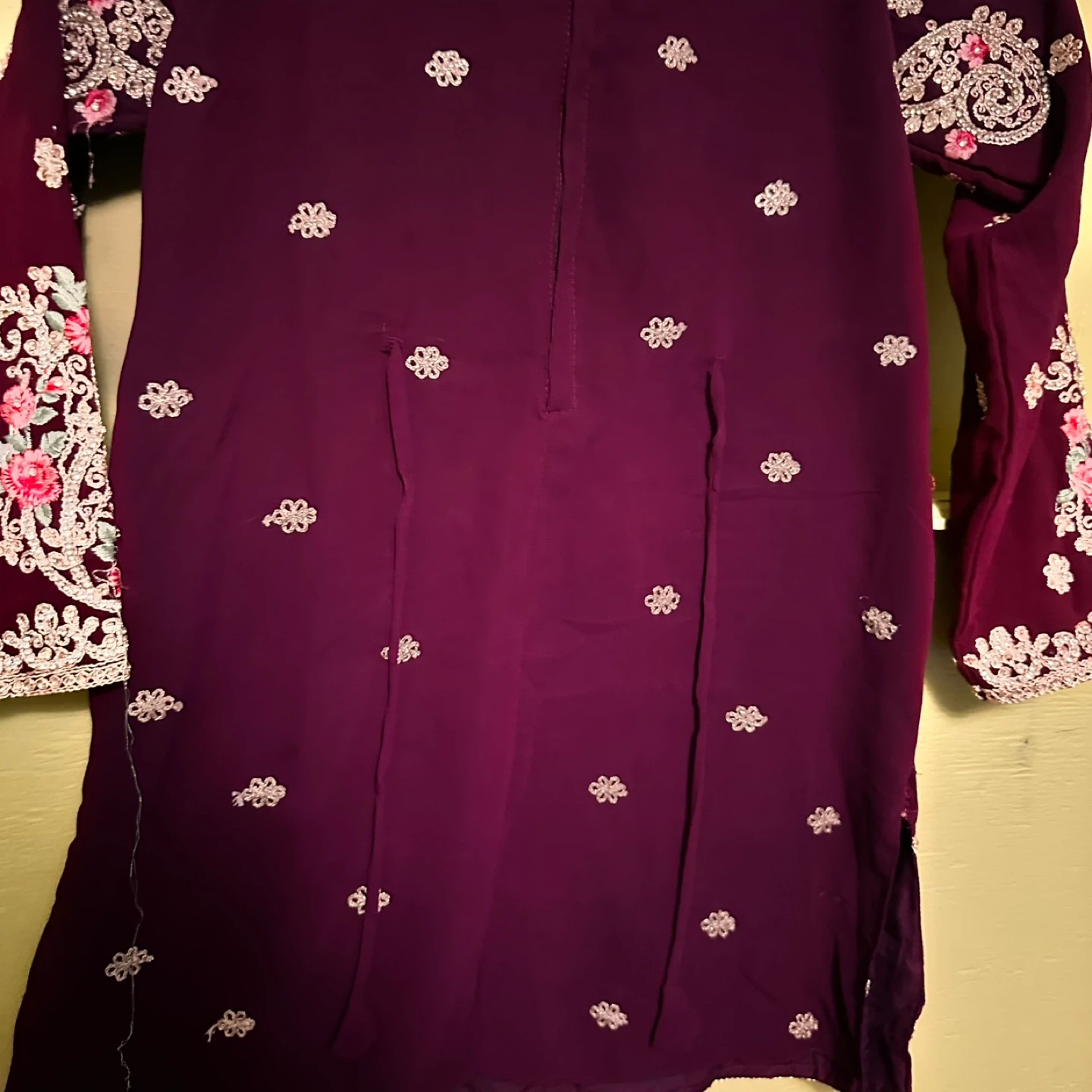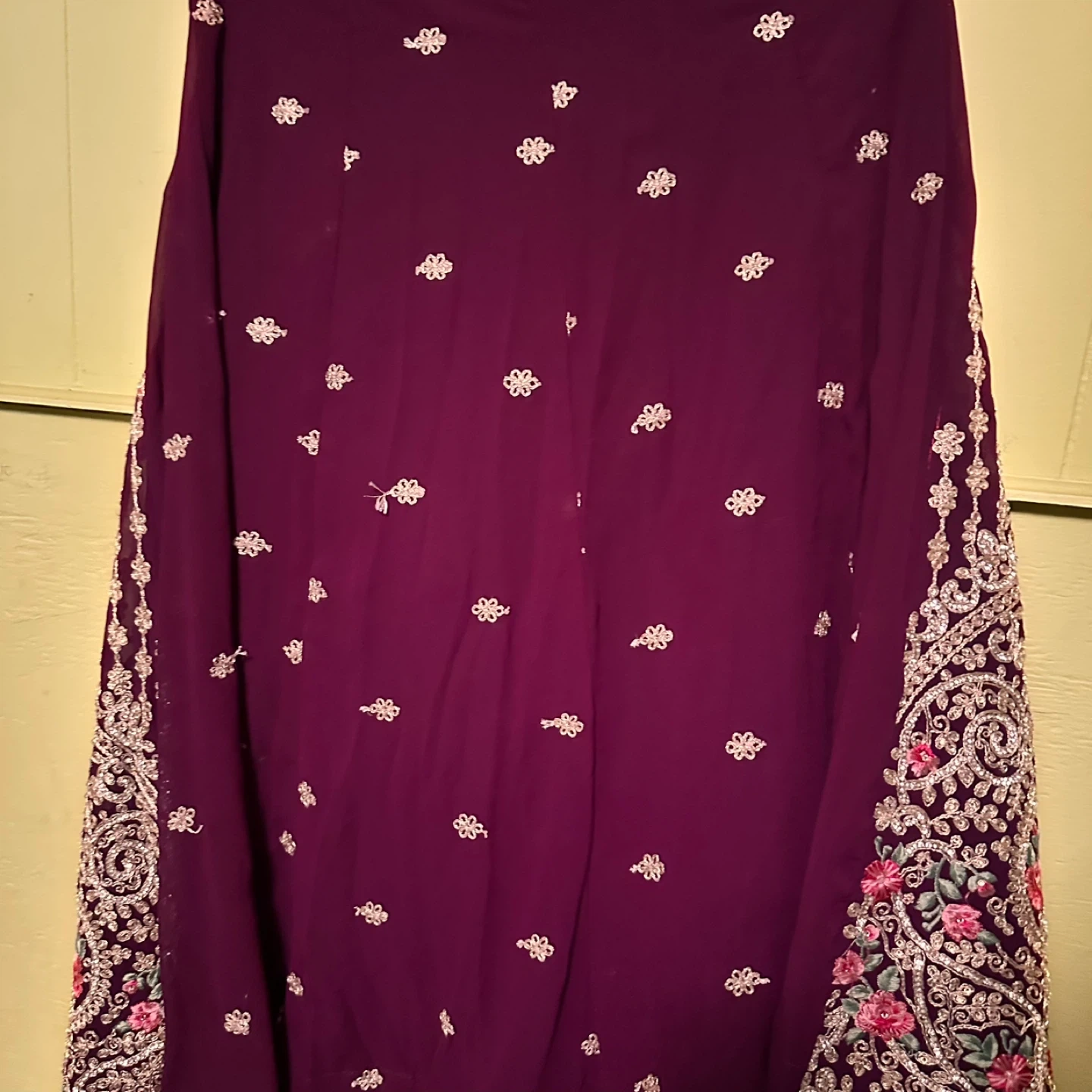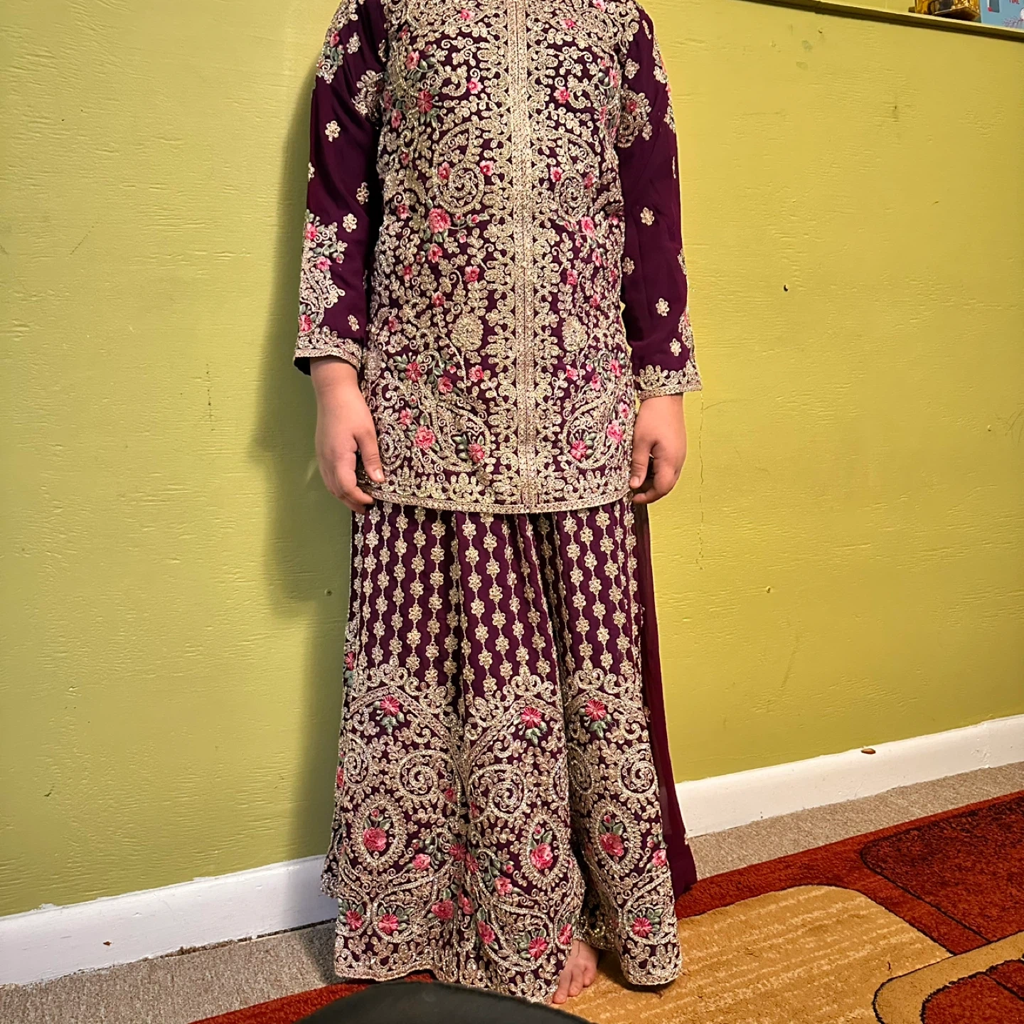 This is a beautiful girls' salwar kameez with intricate embroidery! It's a lovely outfit for special occasions or cultural events. The color is a rich, deep purple. It appears to be in good condition and ready to wear
