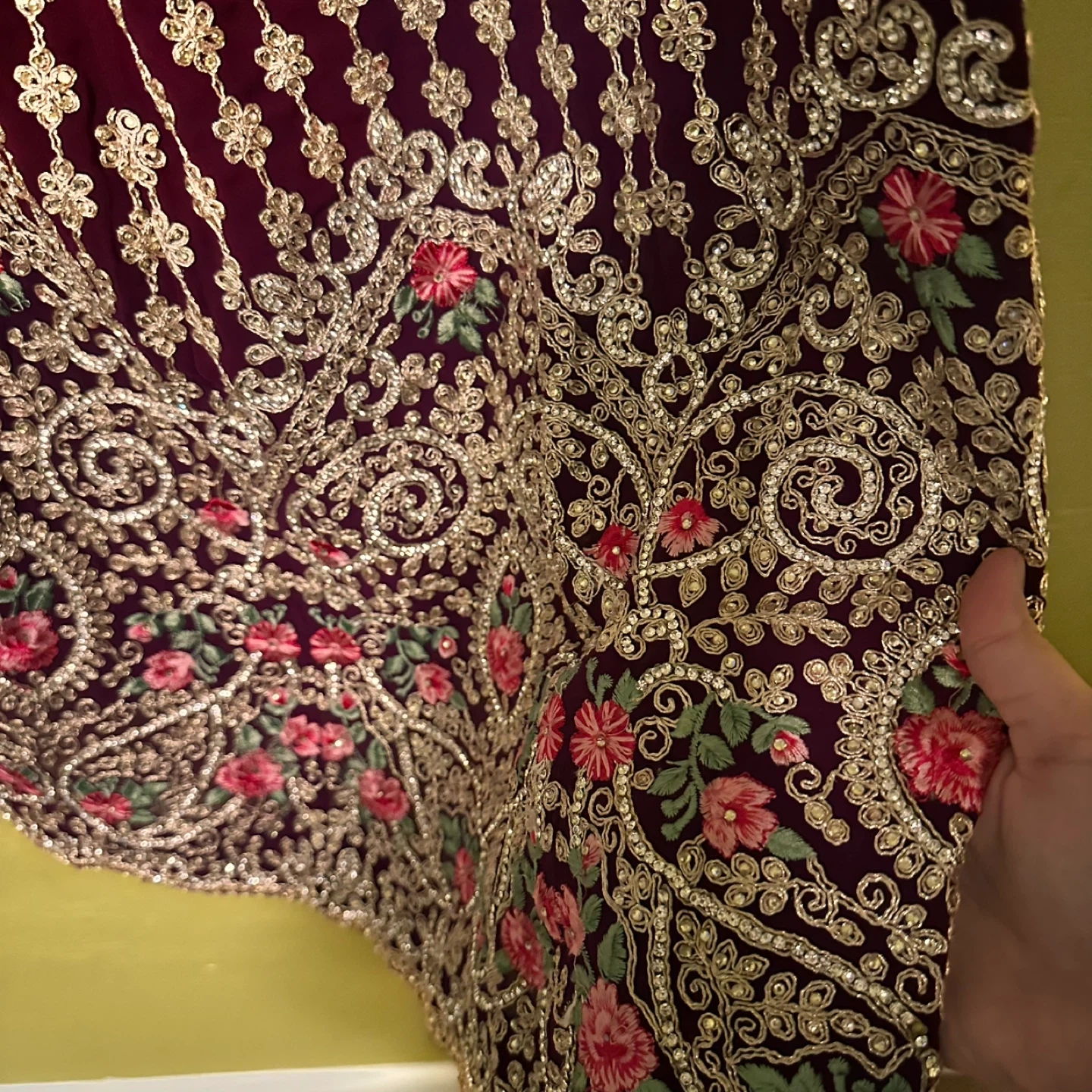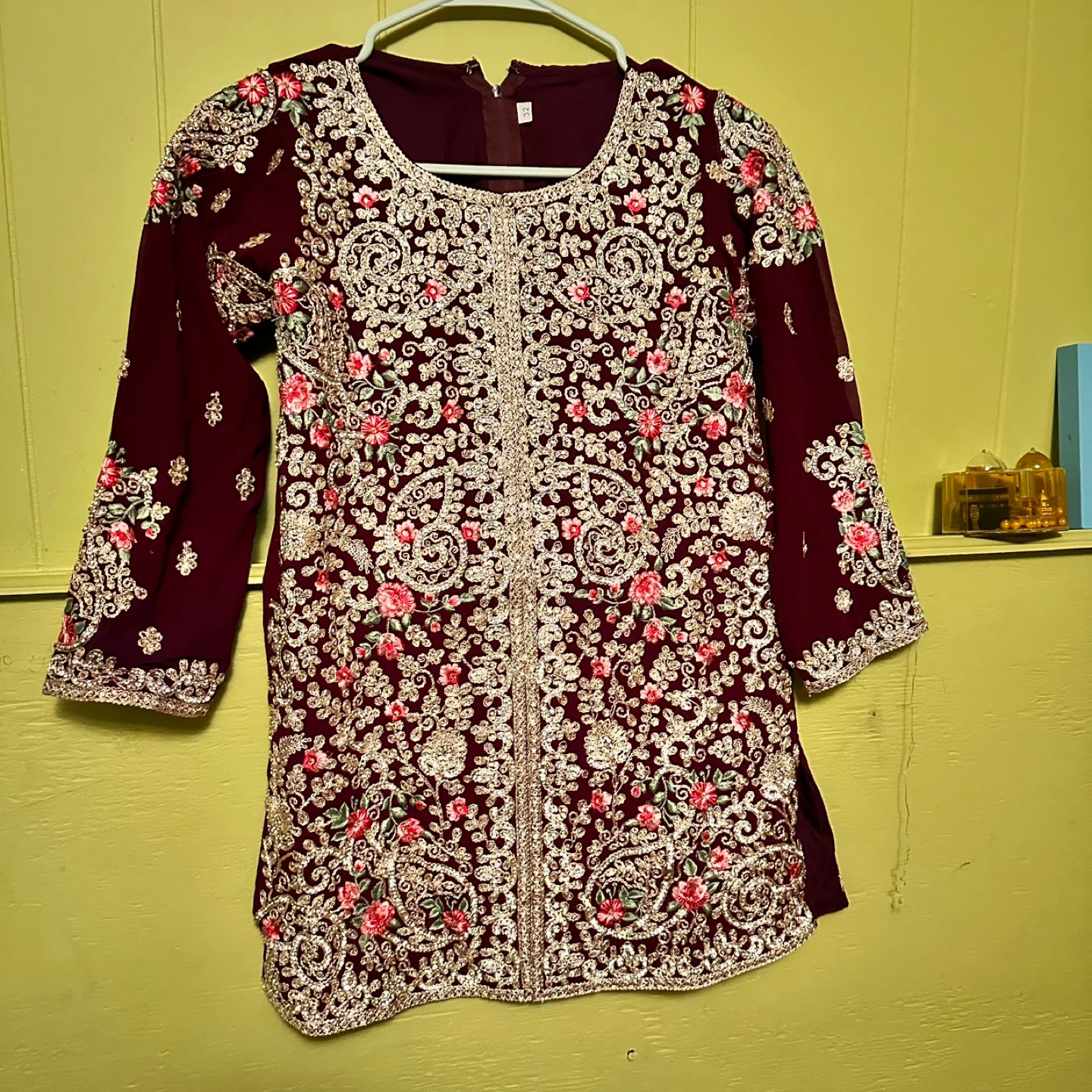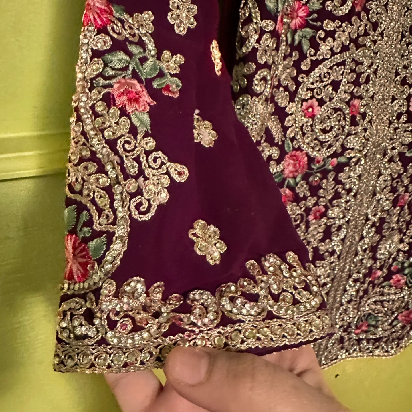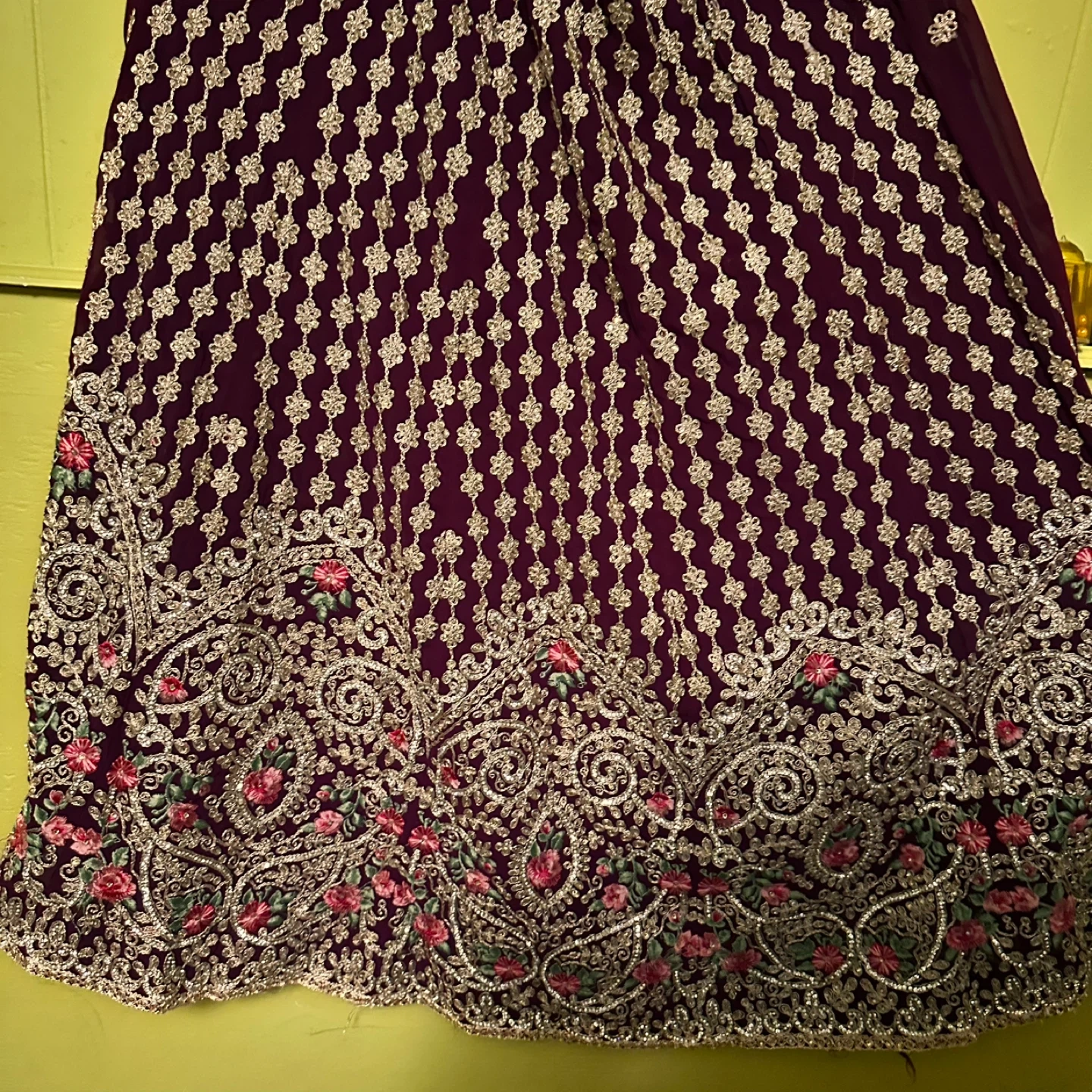 This is a beautiful girls' salwar kameez with intricate embroidery! It's a lovely outfit for special occasions or cultural events. The color is a rich, deep purple. It appears to be in good condition and ready to wear