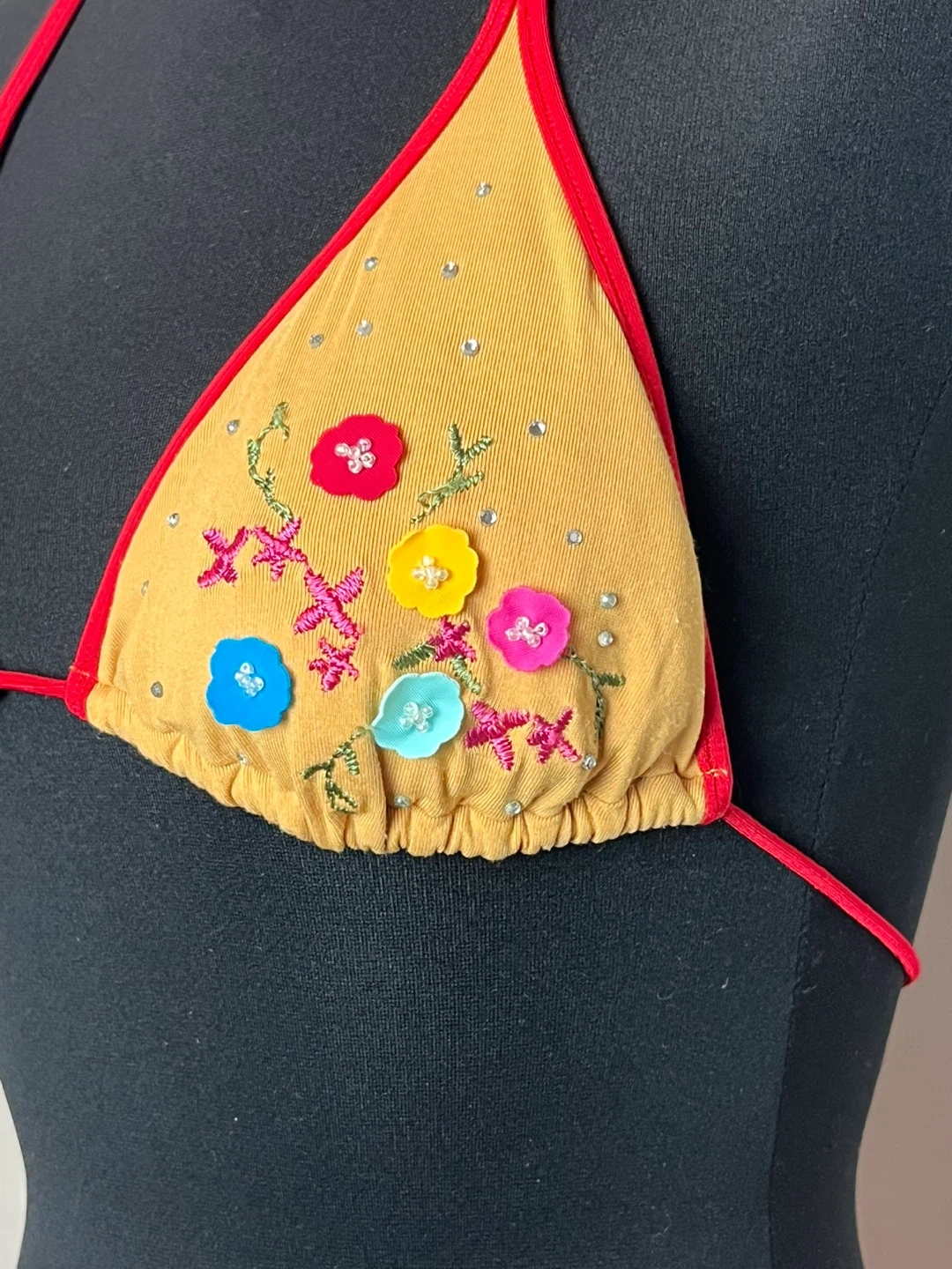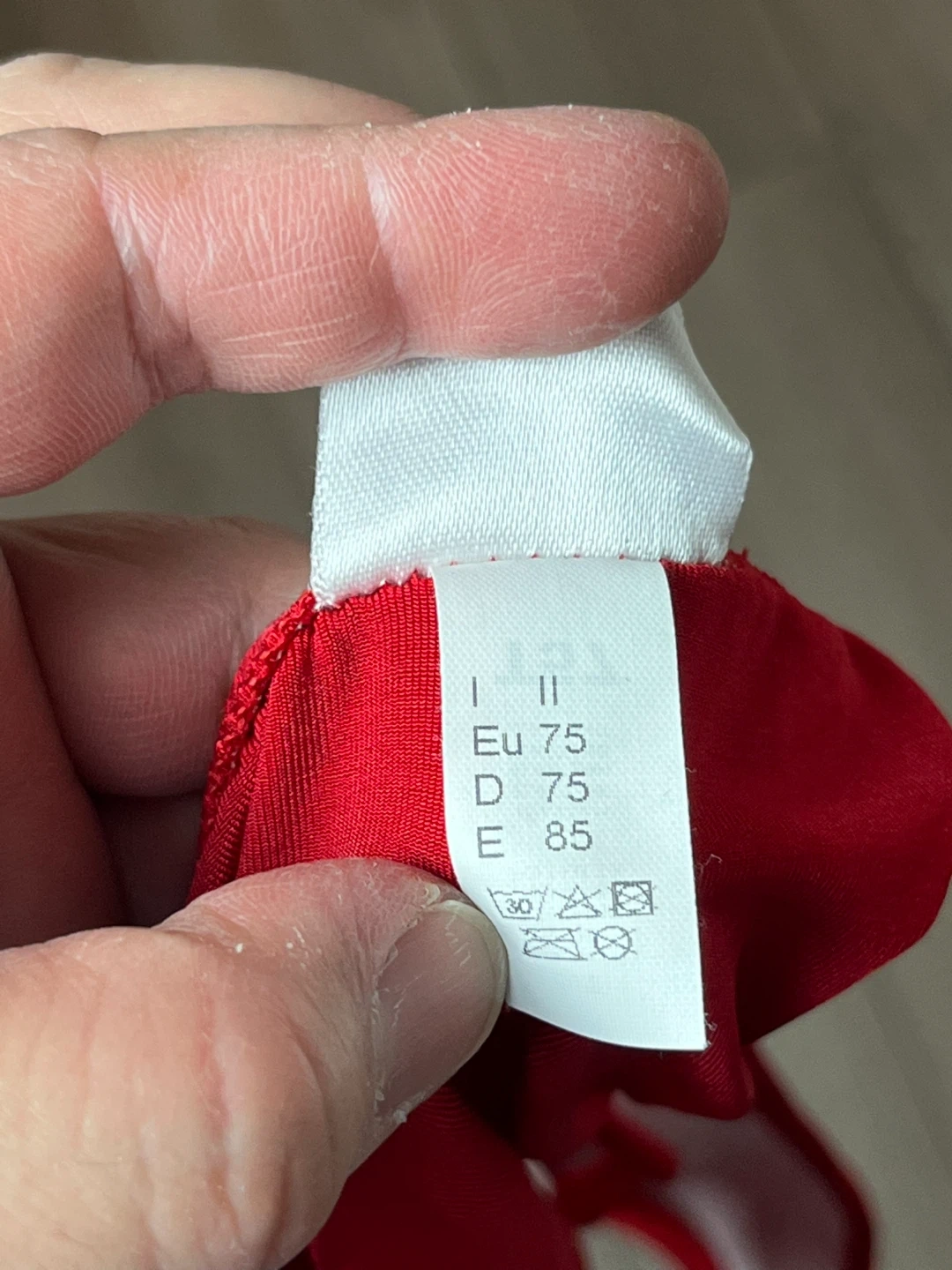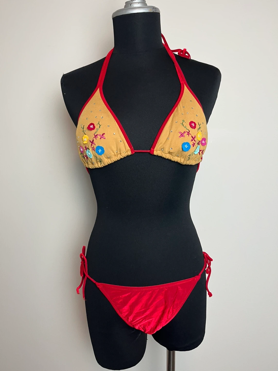 Cute red bikini set! The tag shows the size as EU 75. The other bikini top is tan with colourful flower details.