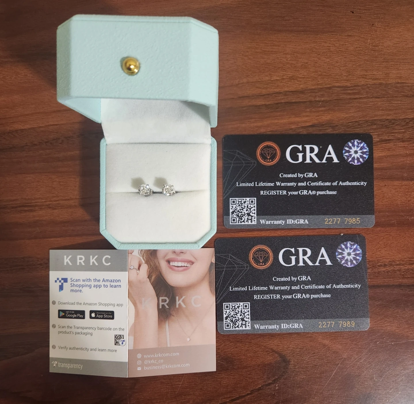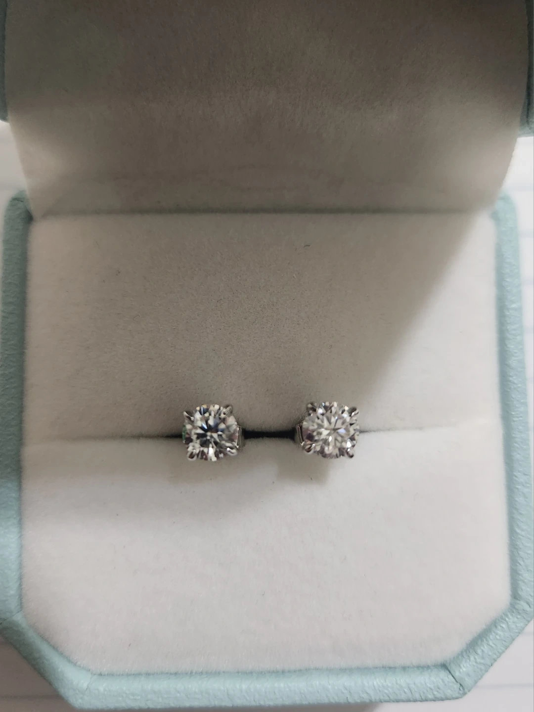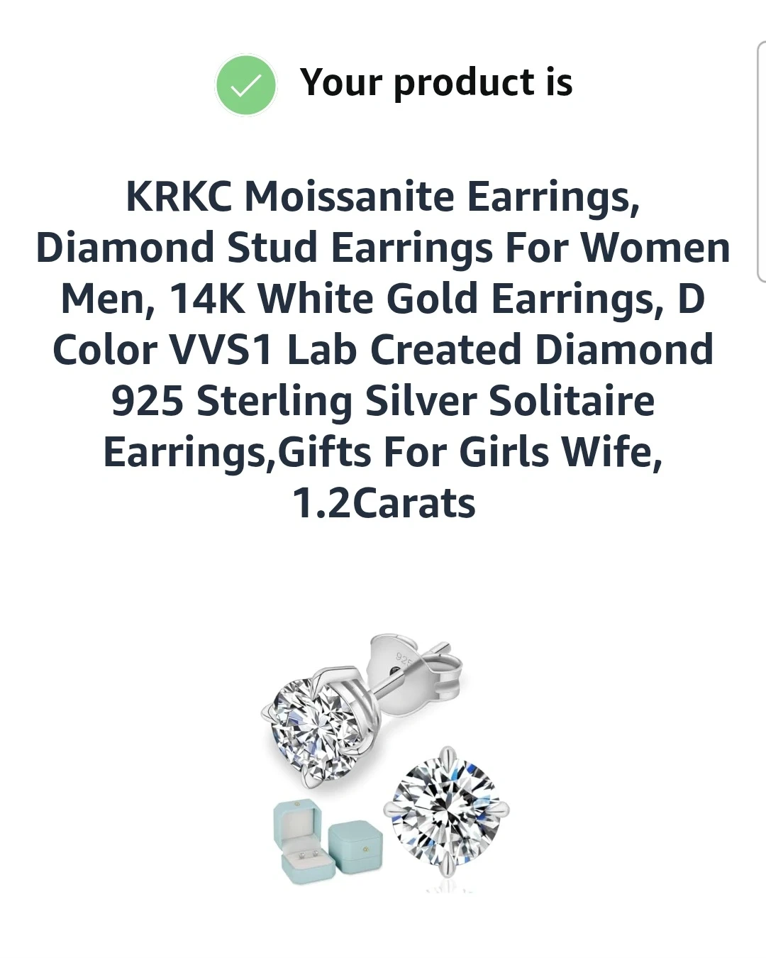 Selling a brand new pair of KRKC Moissanite earrings! They are diamond stud earrings for women, with 14K white gold plating. These are D colour VVS1 lab created diamond 925 sterling silver solitaire earrings, perfect as a gift.