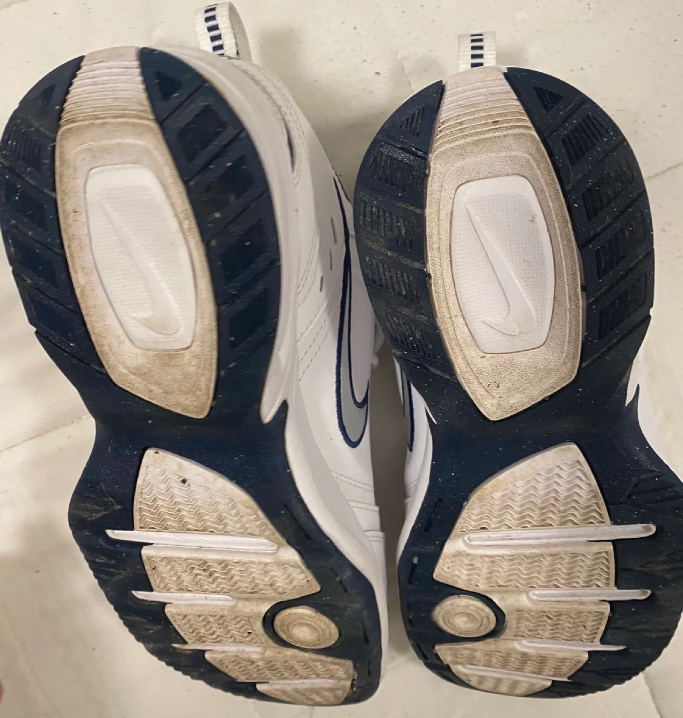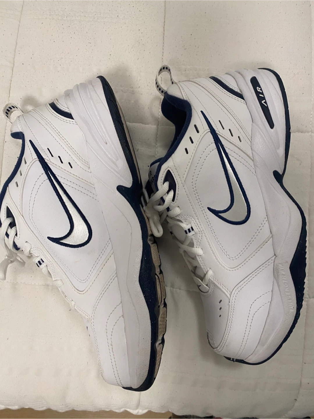 Selling a pair of Nike Air Monarch IV sneakers in white and navy. Hardly worn like new