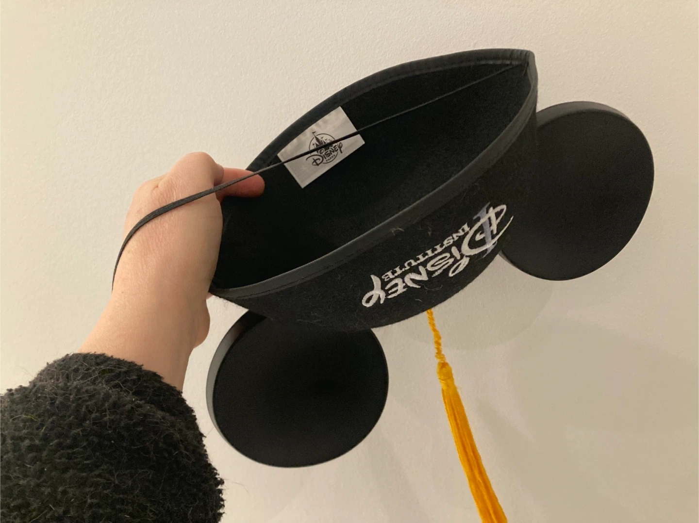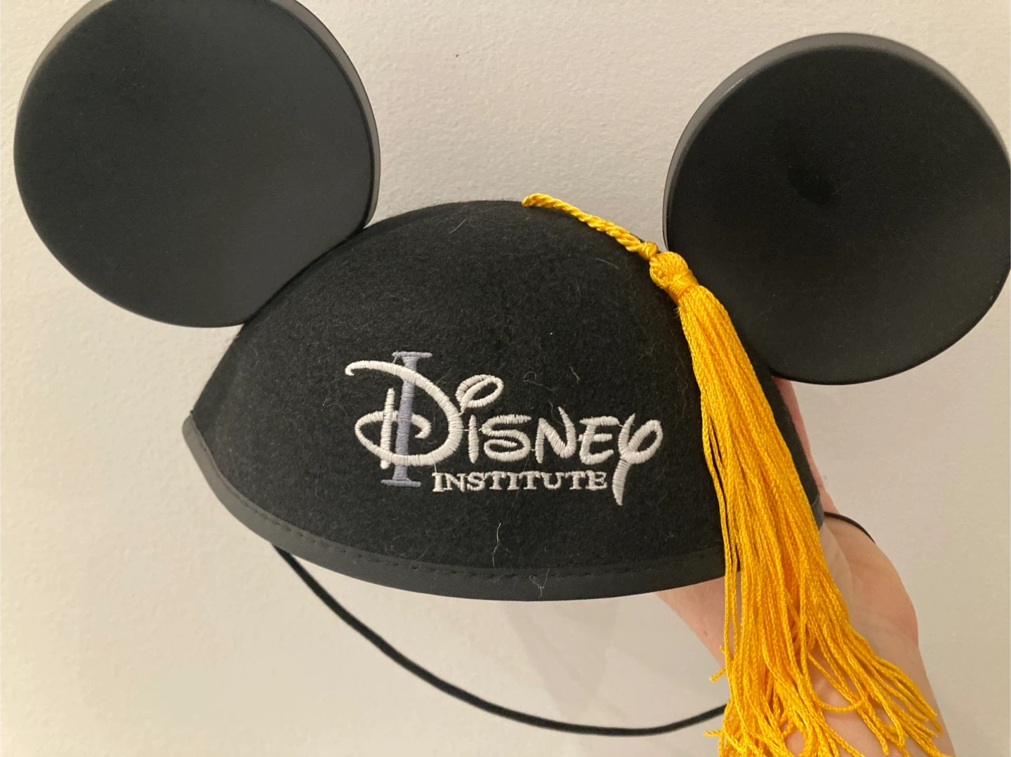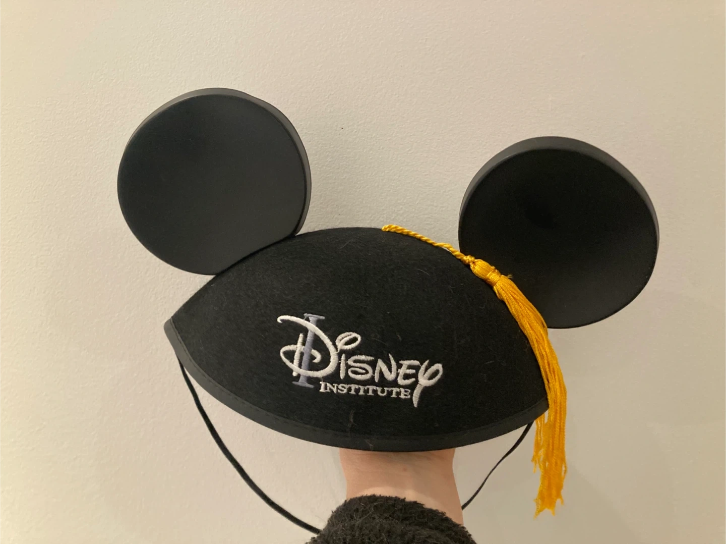 Disney Institute graduation cap / mottât board with the classic Mickey Mouse ears and a yellow tassel. It's in great condition!