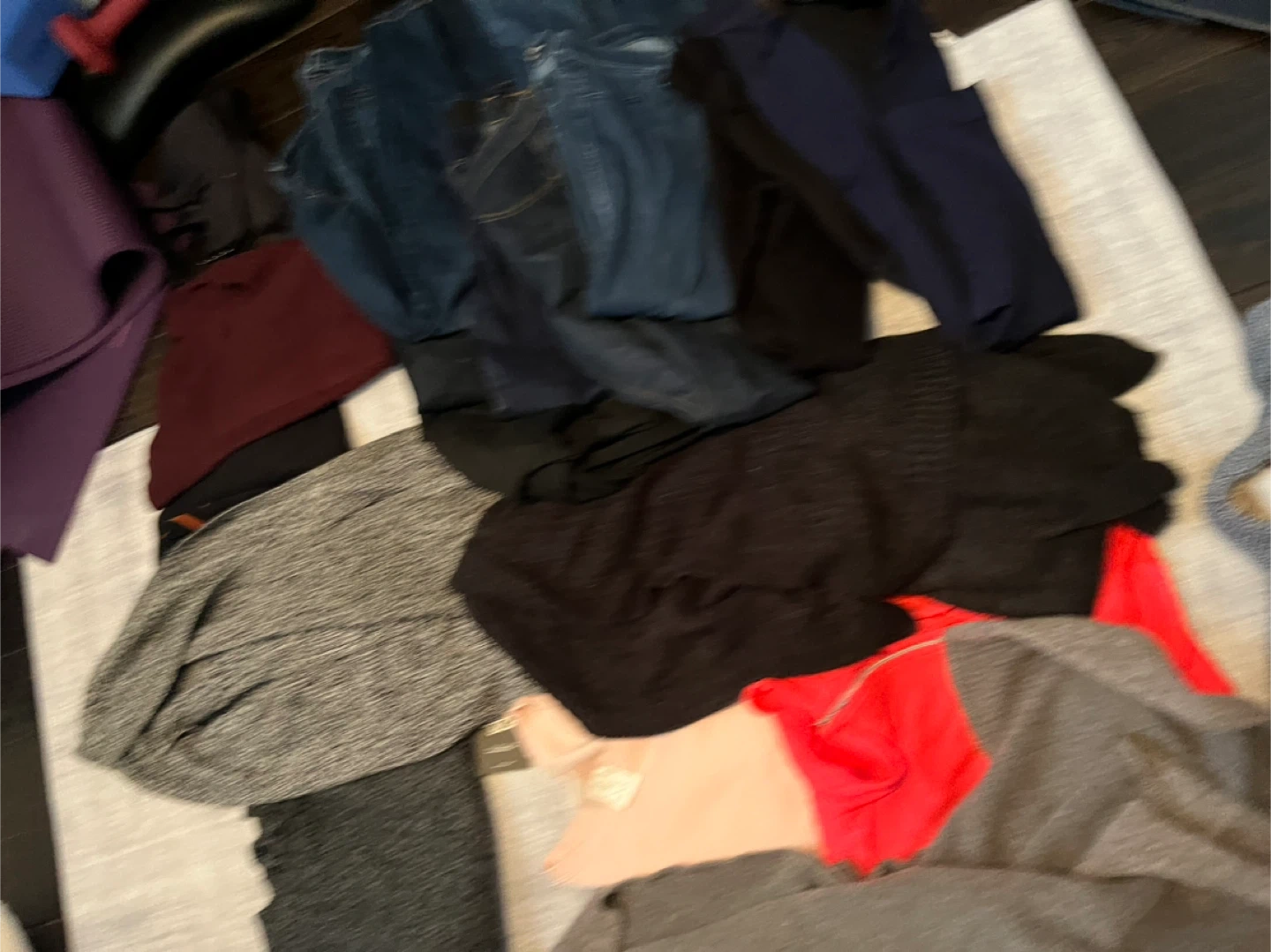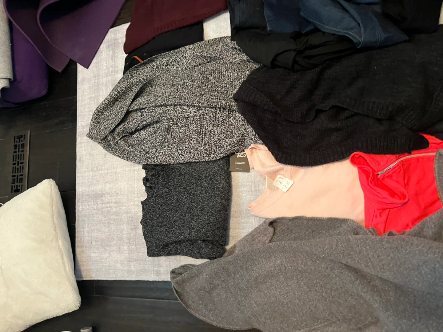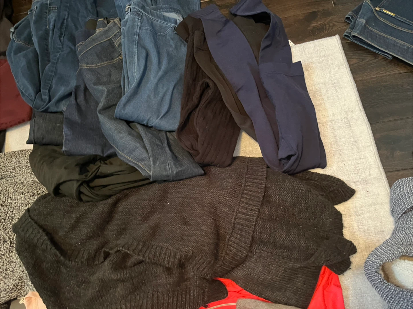 (More items added since taking pics) over 25 pieces included. ) Selling a mixed lot of clothing including sweaters, jeans, and tops. Various colours and materials. Great for expanding your wardrobe!