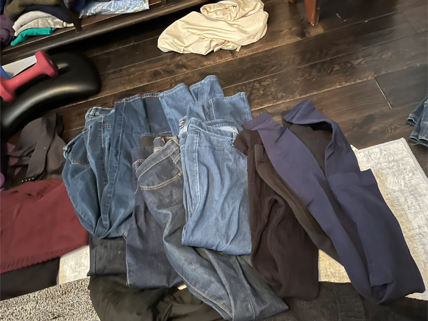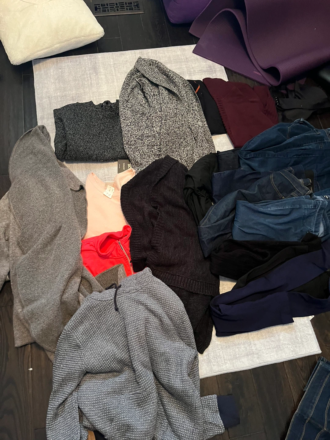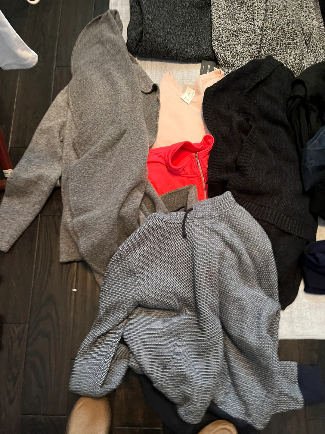 (More items added since taking pics) over 25 pieces included. ) Selling a mixed lot of clothing including sweaters, jeans, and tops. Various colours and materials. Great for expanding your wardrobe!