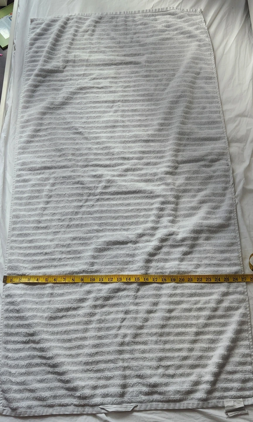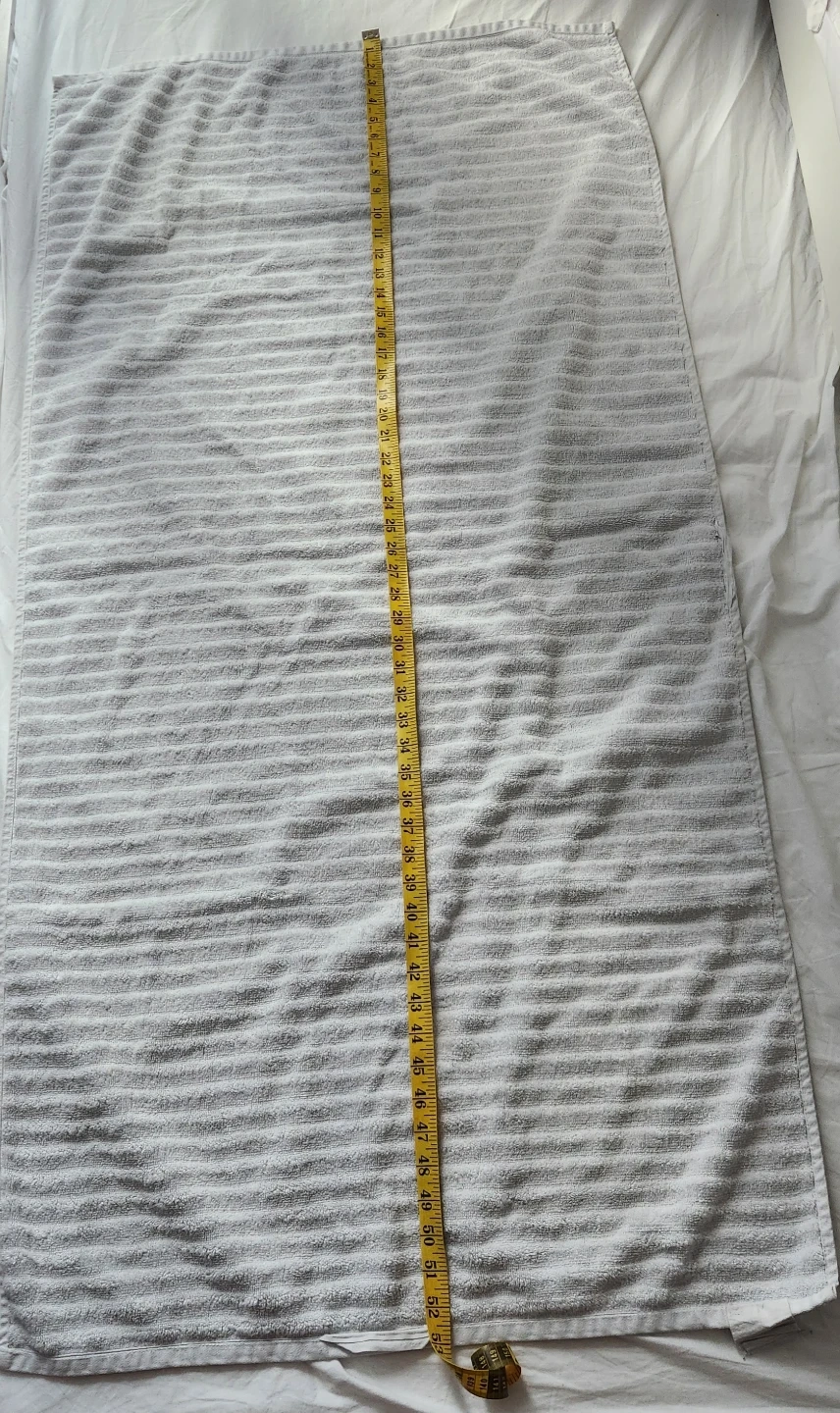 Selling two bath towels in good condition! One is a light pink with a unique rainbow design and the other is a white striped towel. They both measure approximately 27 inches by 52 inches.
