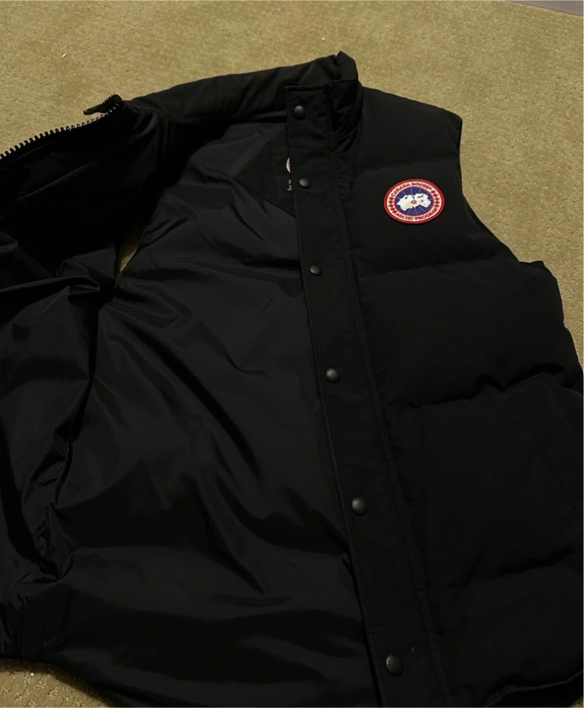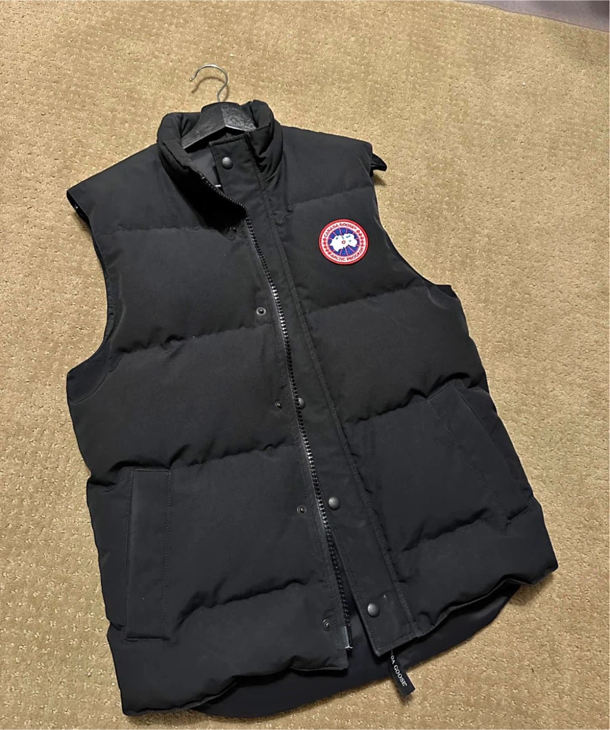 Selling a Canada Goose down vest in black, size small fits medium. It's in great condition and perfect for layering! The vest is made with high-quality down and feathers to keep you warm and comfortable. The Canada Goose logo is proudly displayed on the chest. A great addition to any wardrobe!