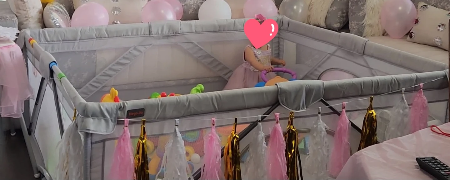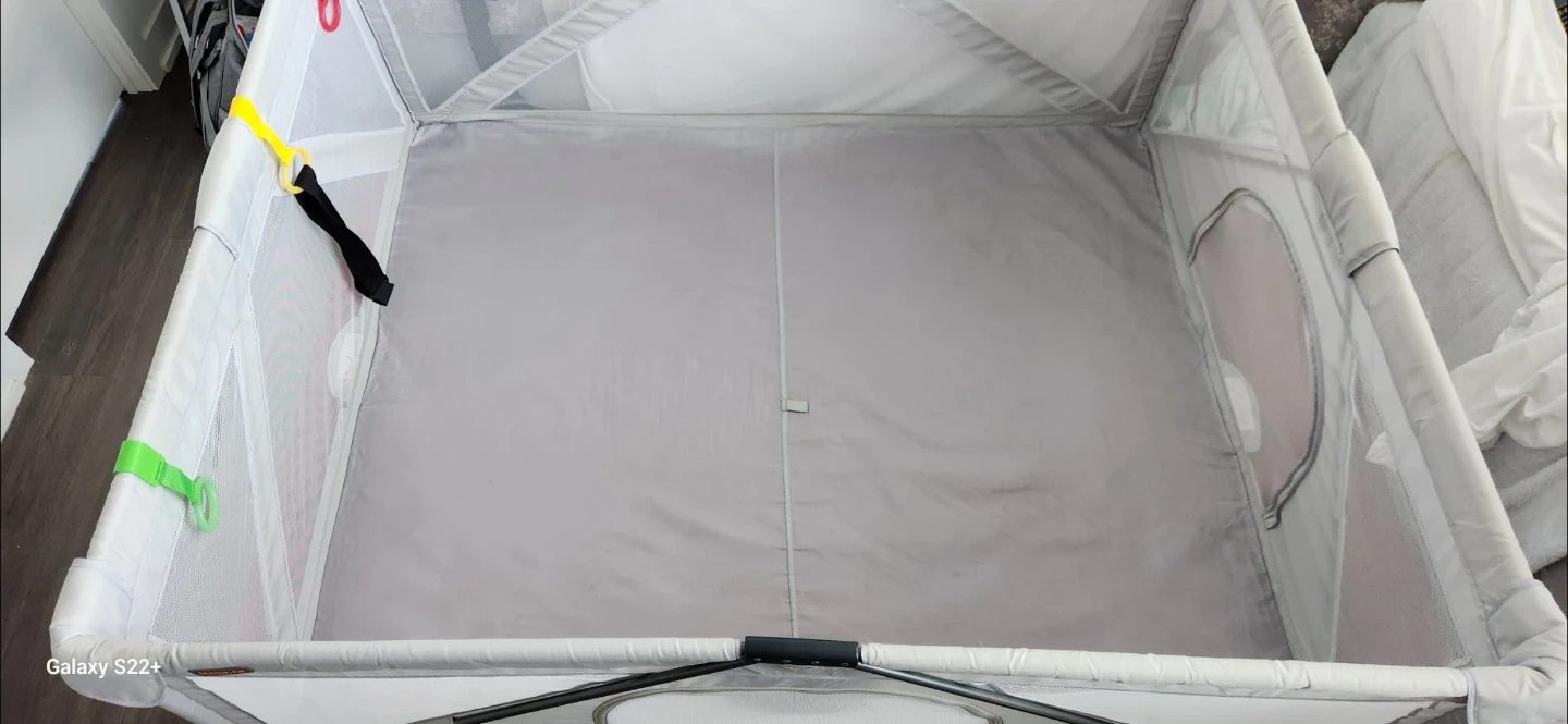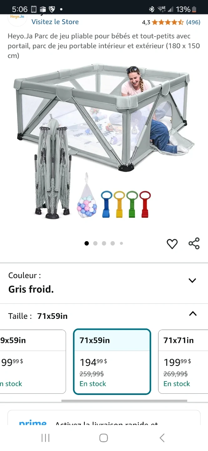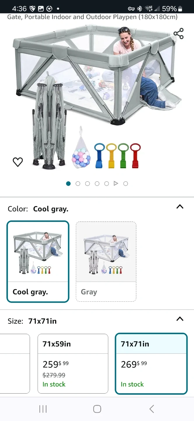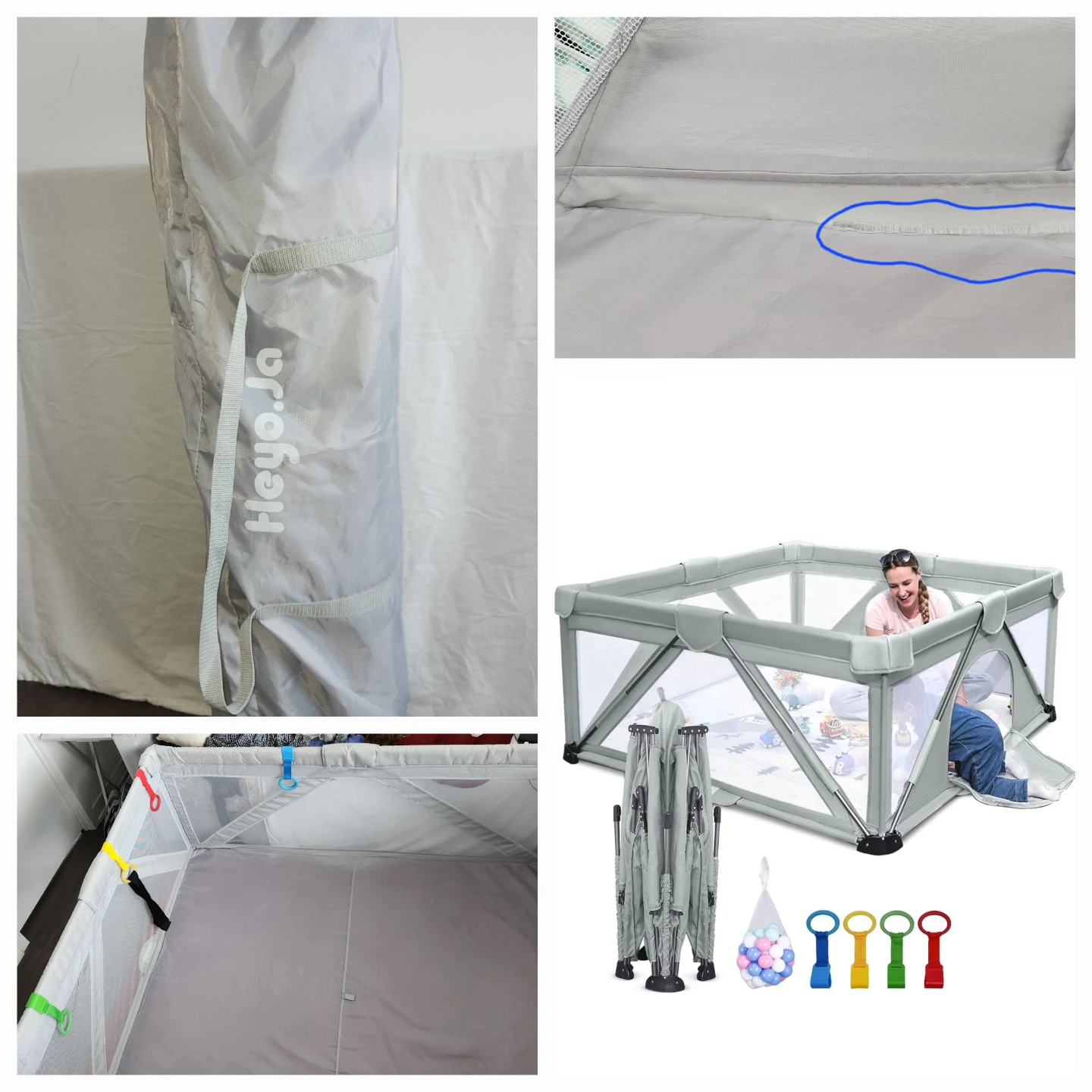 This Heyo.Ja portable playpen is perfect for indoor and outdoor use! It's in cool gray and measures 71x71x59 inches. It's easy to set up and take down, making it great for travel or storage