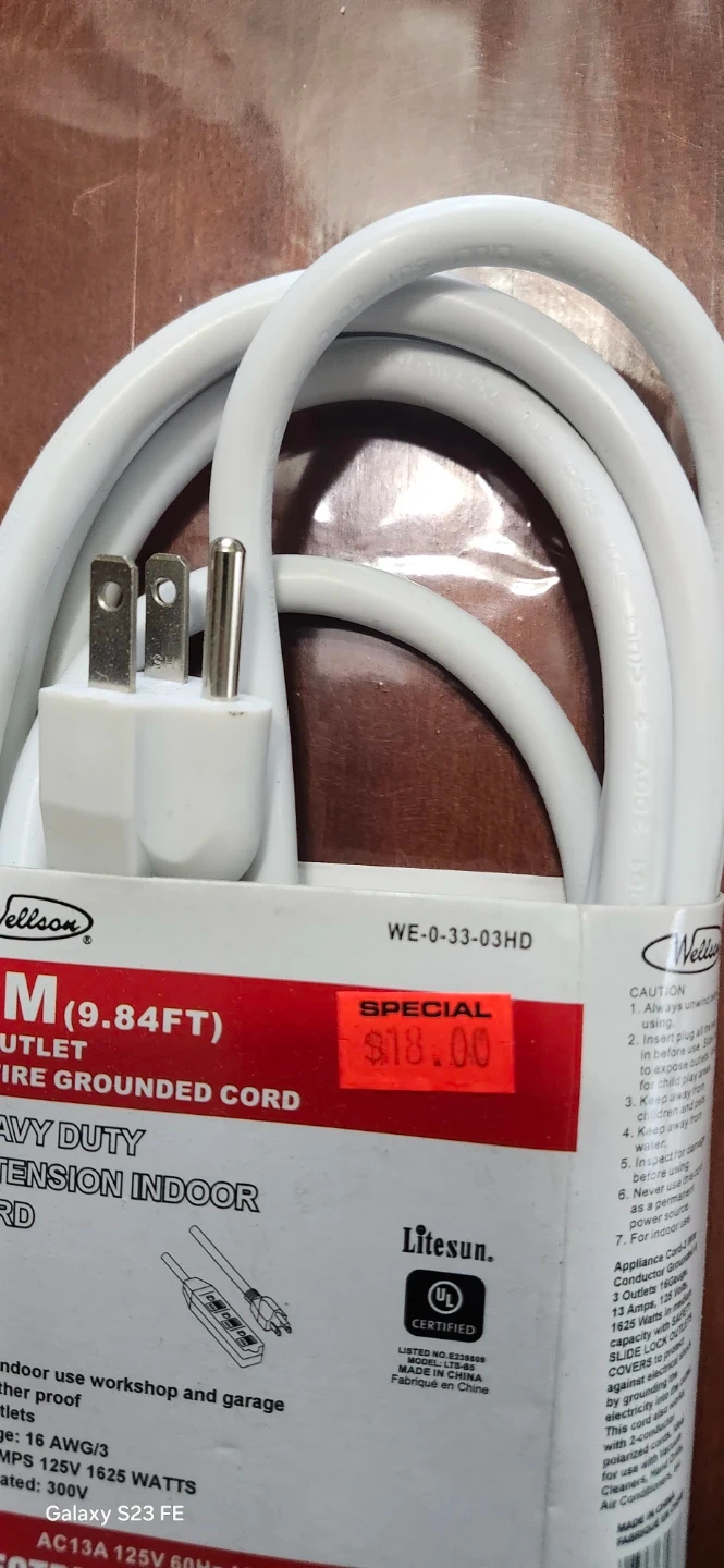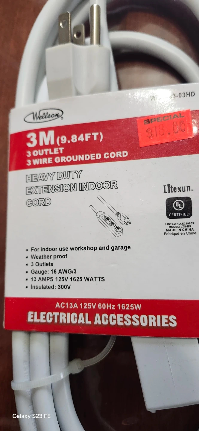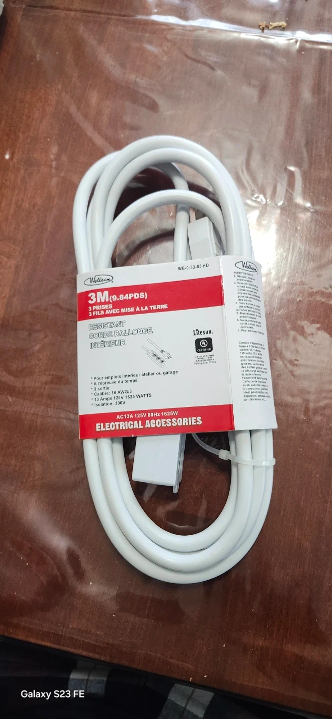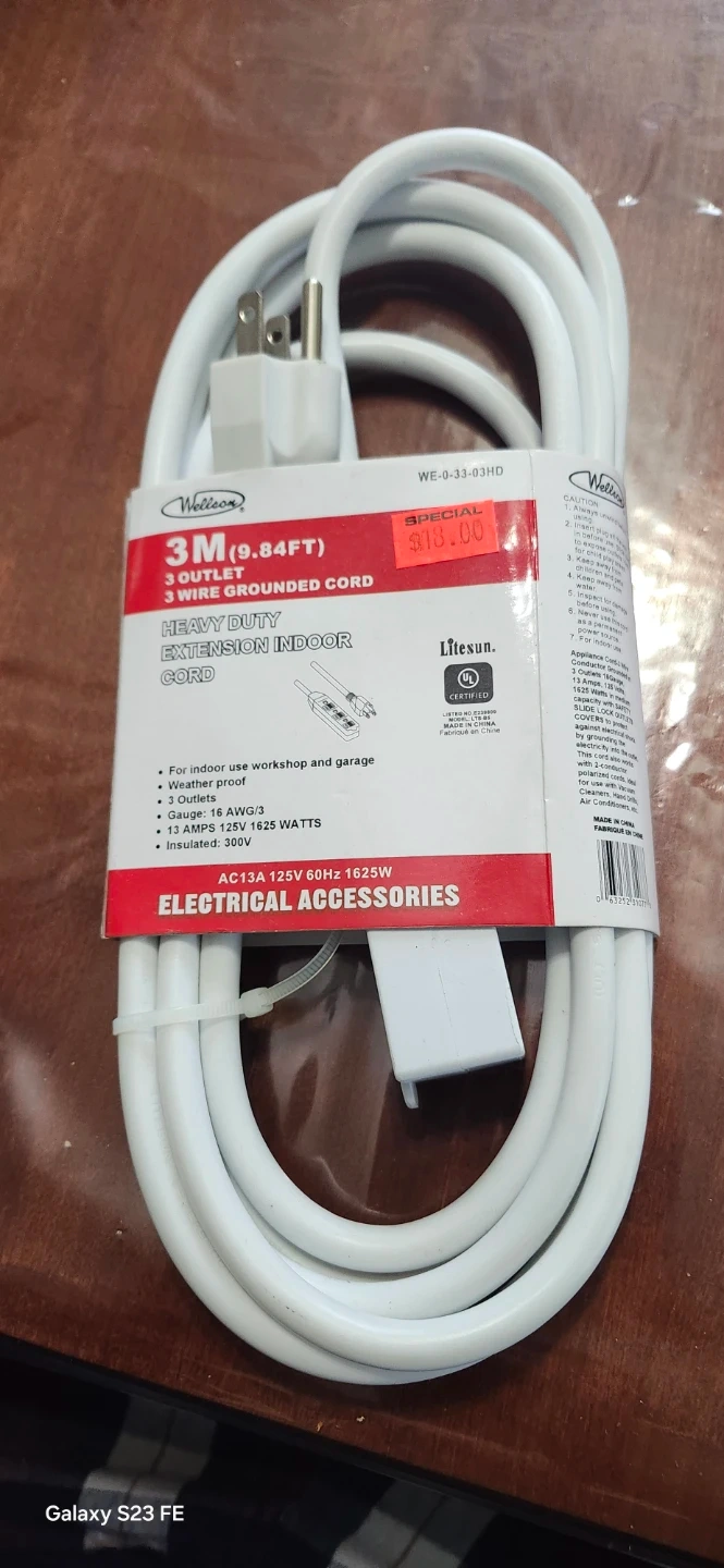 Selling a brand new Wellson 3M (9.84FT) 3-outlet 3-wire grounded heavy-duty indoor extension cord. It's weather-proof and suitable for indoor use in a workshop or garage. Price firm final cash only pickup no delivery 801 O'Connor drive outside TD Canada Trust bank door East York.