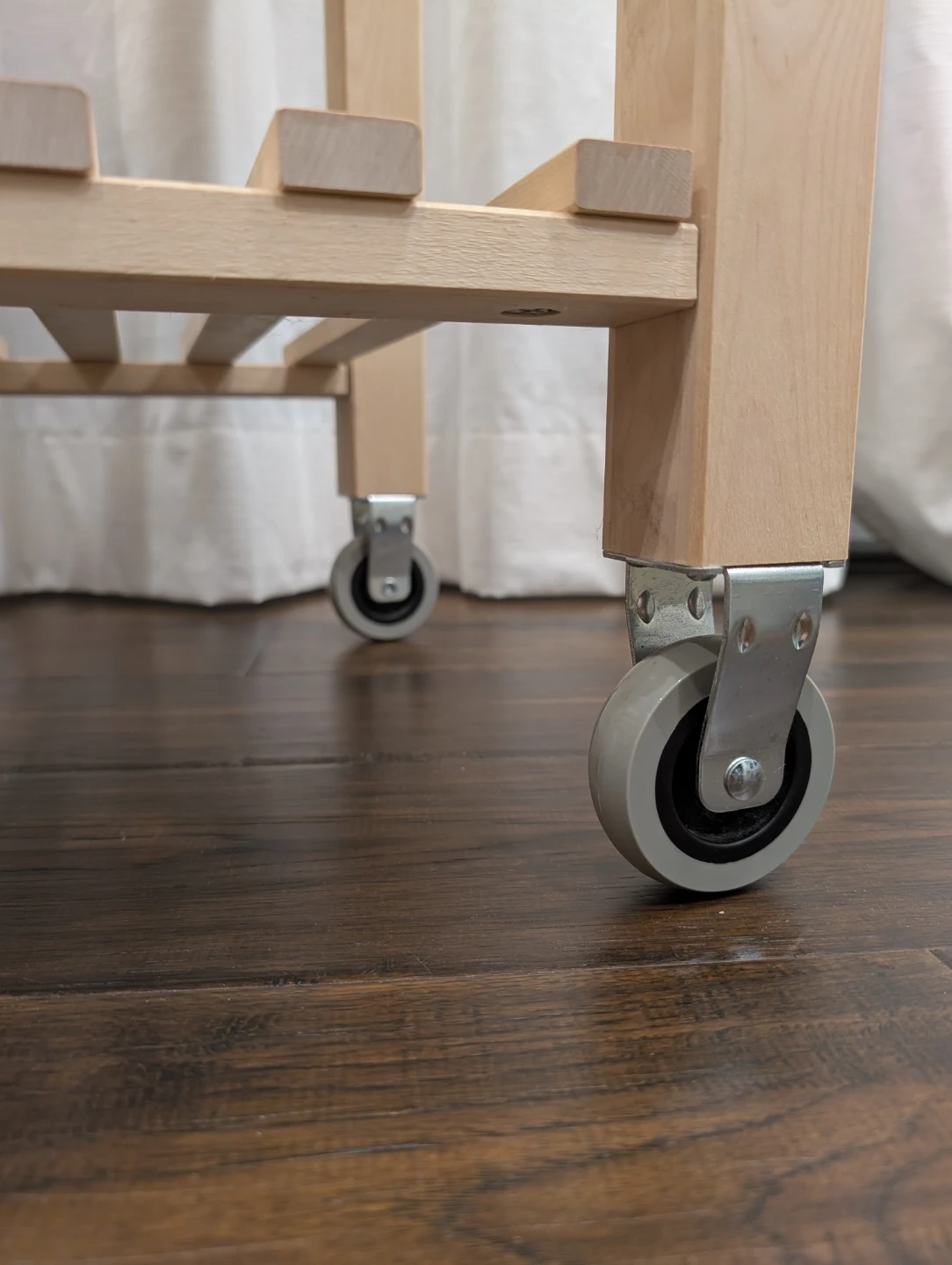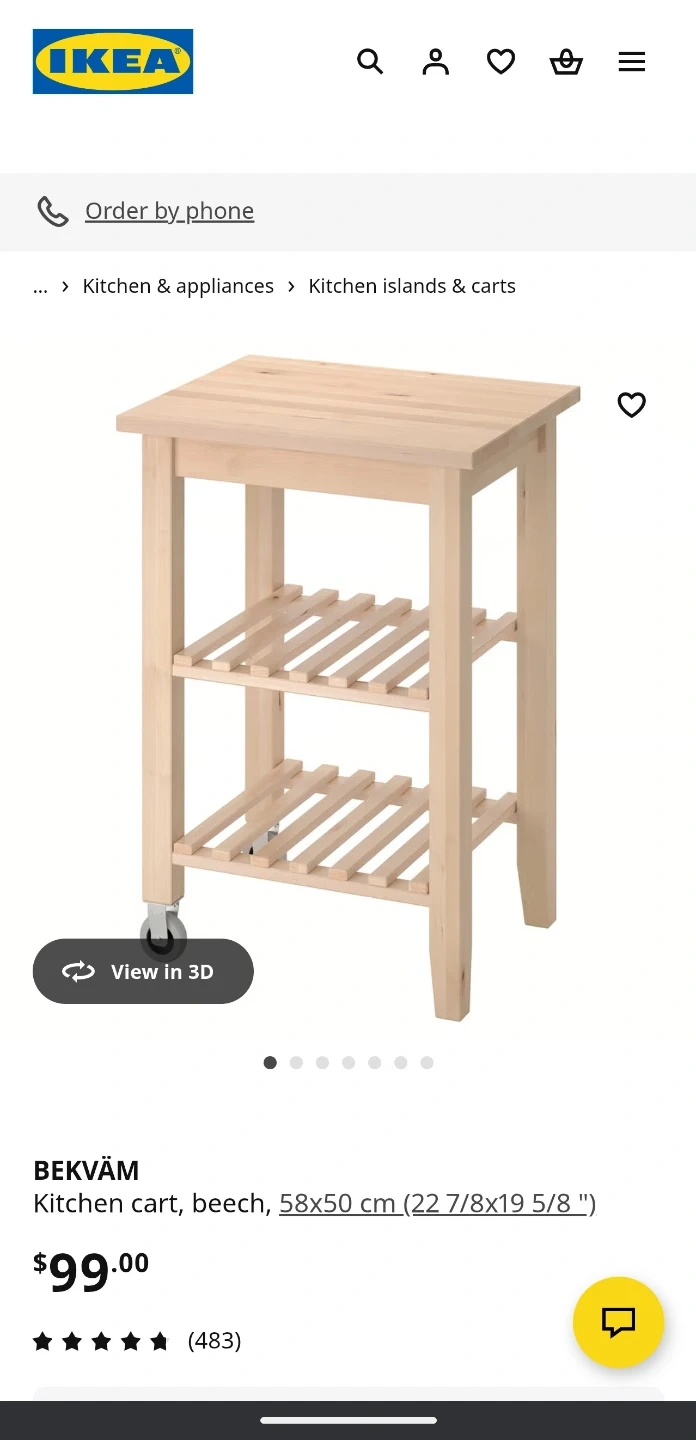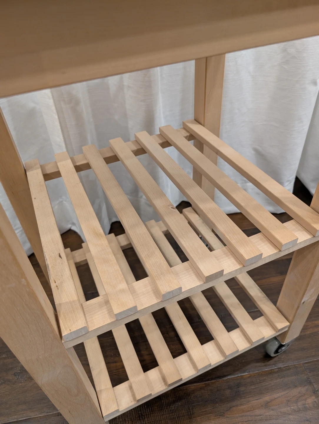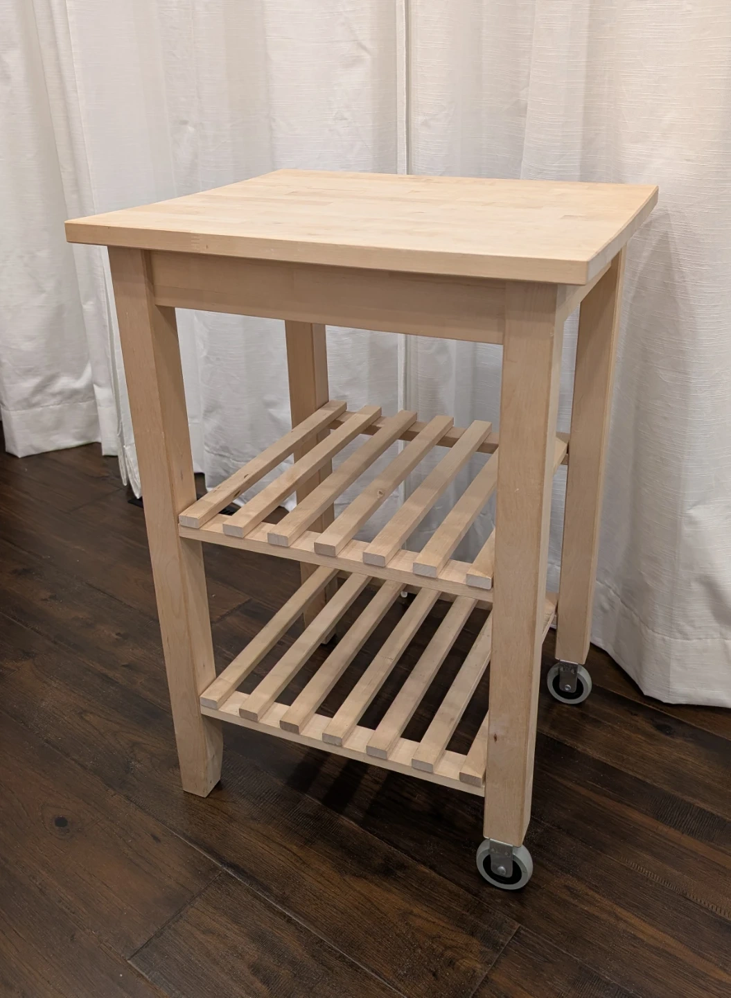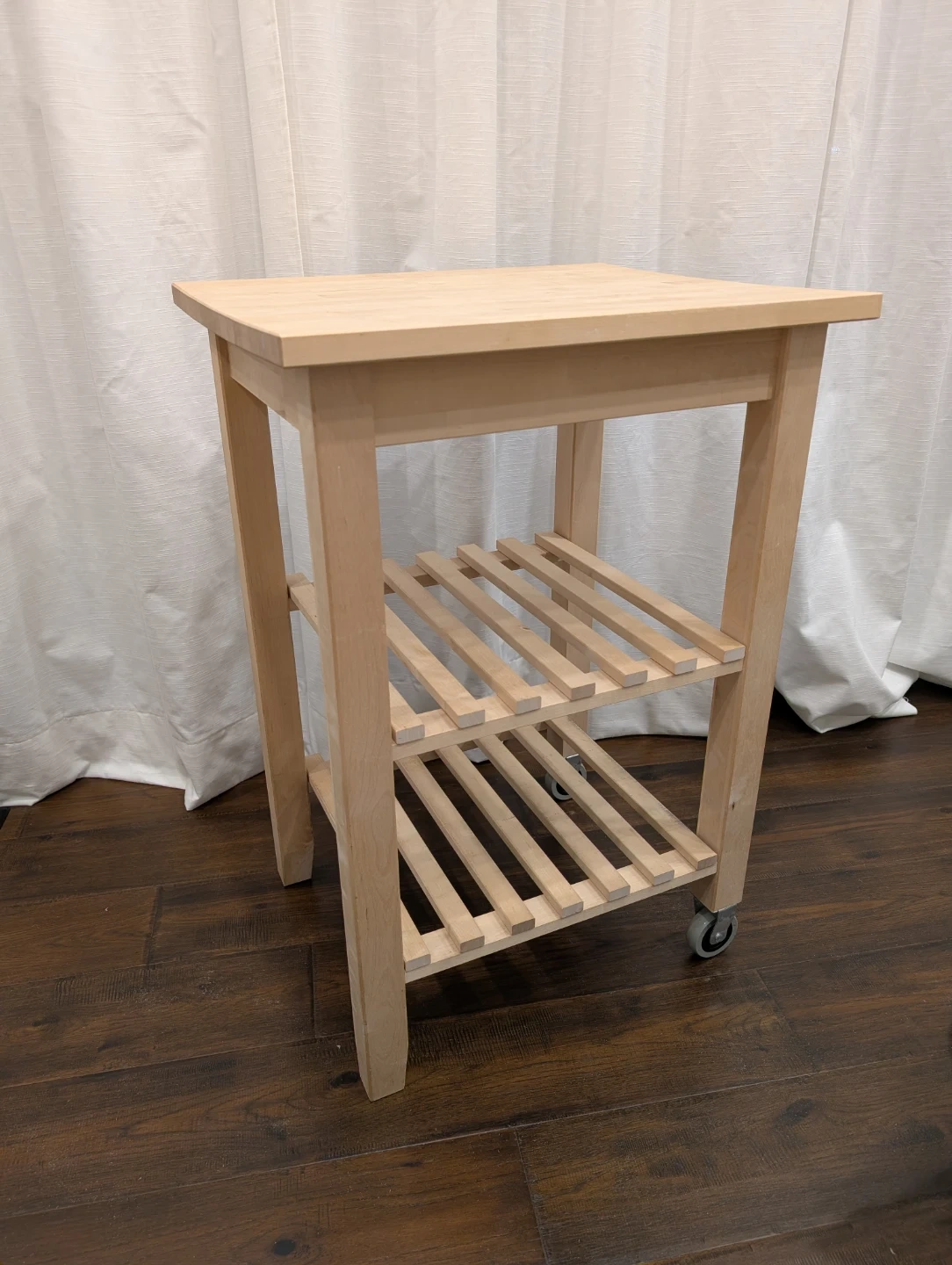 Selling a used IKEA BEKVÄM kitchen cart in beech. It's a handy little cart with a solid wood worktop and two shelves. The dimensions are 58x50 cm (22 7/8x19 5/8 "). It's on wheels, so it's easy to move around your kitchen or workspace.