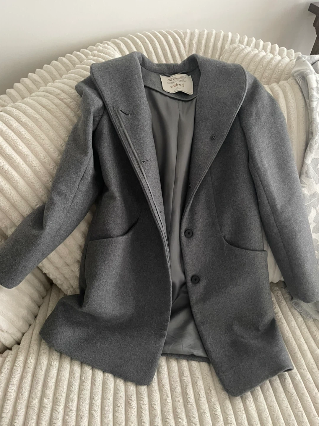 Selling a Wilfred The Cocoon Coat in size XS! It's a beautiful grey colour and made with a wool blend. This coat is in excellent condition and ready to keep you warm this season