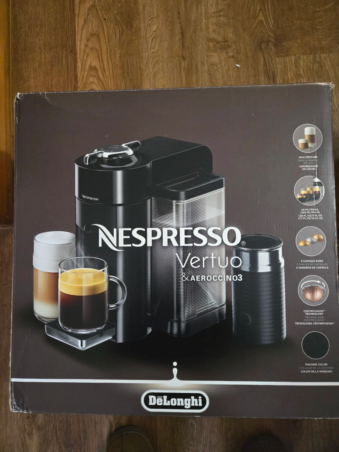Selling a Nespresso Vertuo & Aeroccino3 machine by DeLonghi. It's in great condition and ready to make delicious coffee and froth milk! It has Centrifusion technology and makes 3 capsule sizes. The milk frother can make 40 ml/150 ml /230 ml/414 ml (1.35 fl oz/5 fl oz /7.7 fl oz/14 fl oz). Missing sample capsules