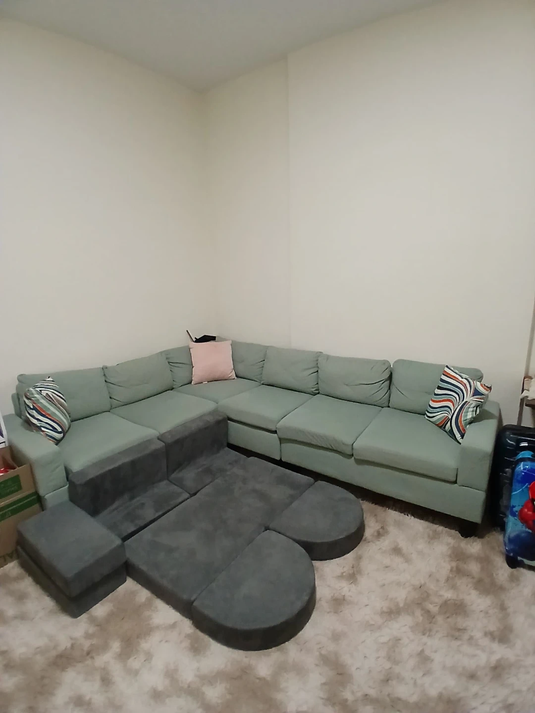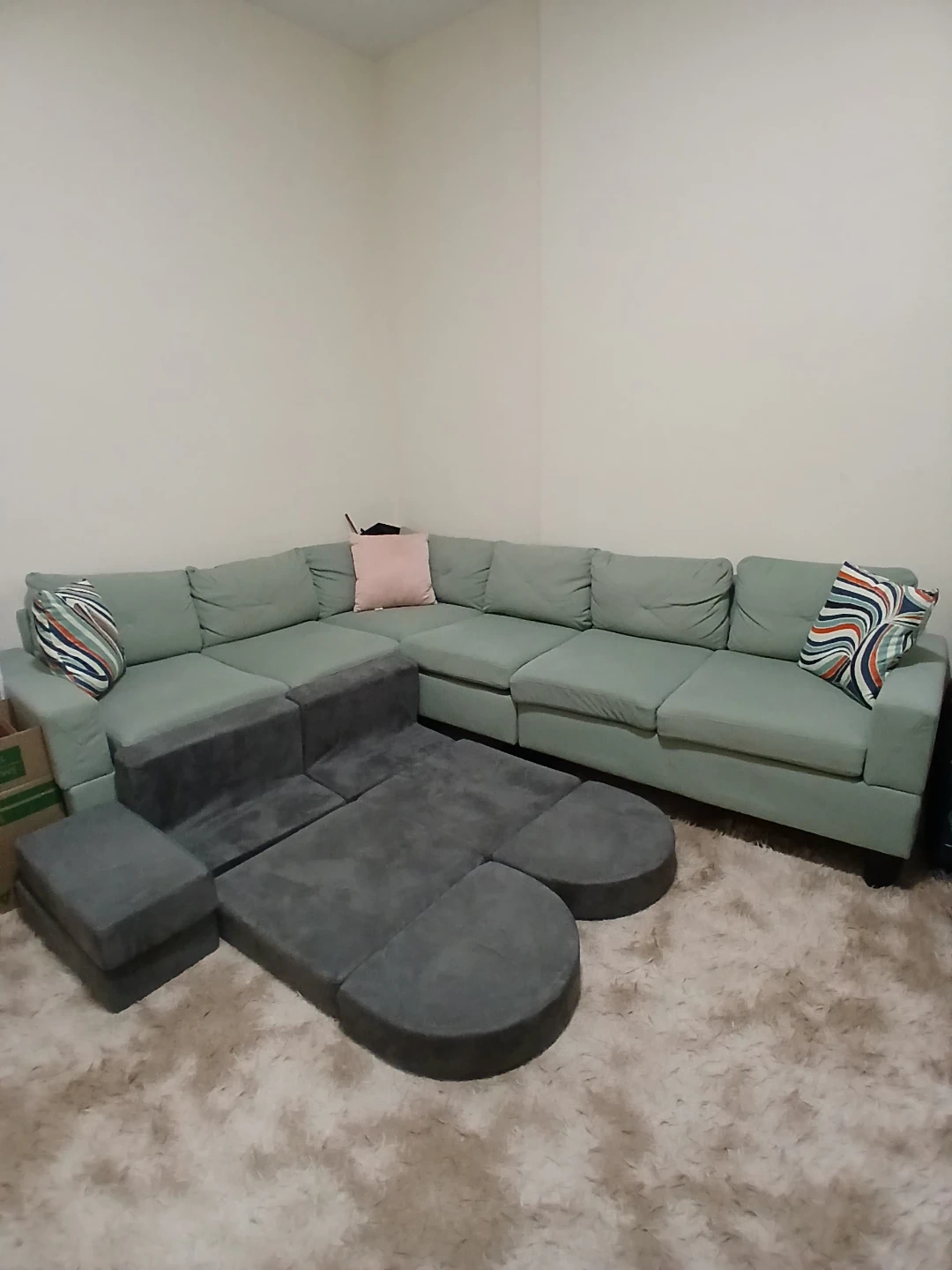 Selling our Nugget Comfort couch in a lovely sage green color! It's perfect for kids to play on or for lounging around. The couch is in good condition and ready for a new home