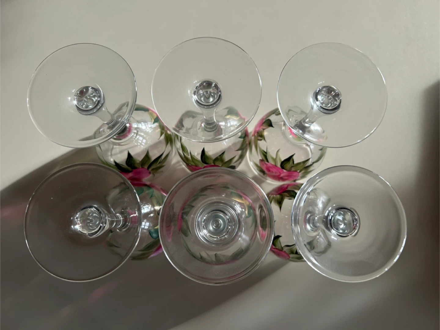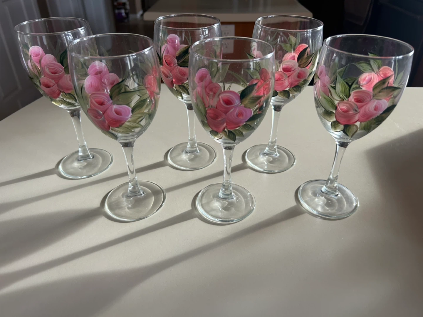 Selling a set of six artisan hand painted wine glasses, each with a pink rose floral design.