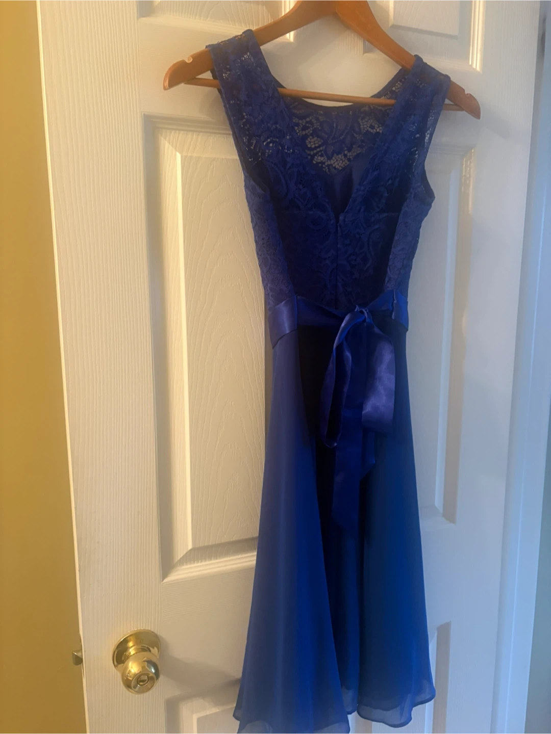 Selling a beautiful blue lace dress. It features a delicate lace bodice and a flowing skirt. Perfect for a special occasion!