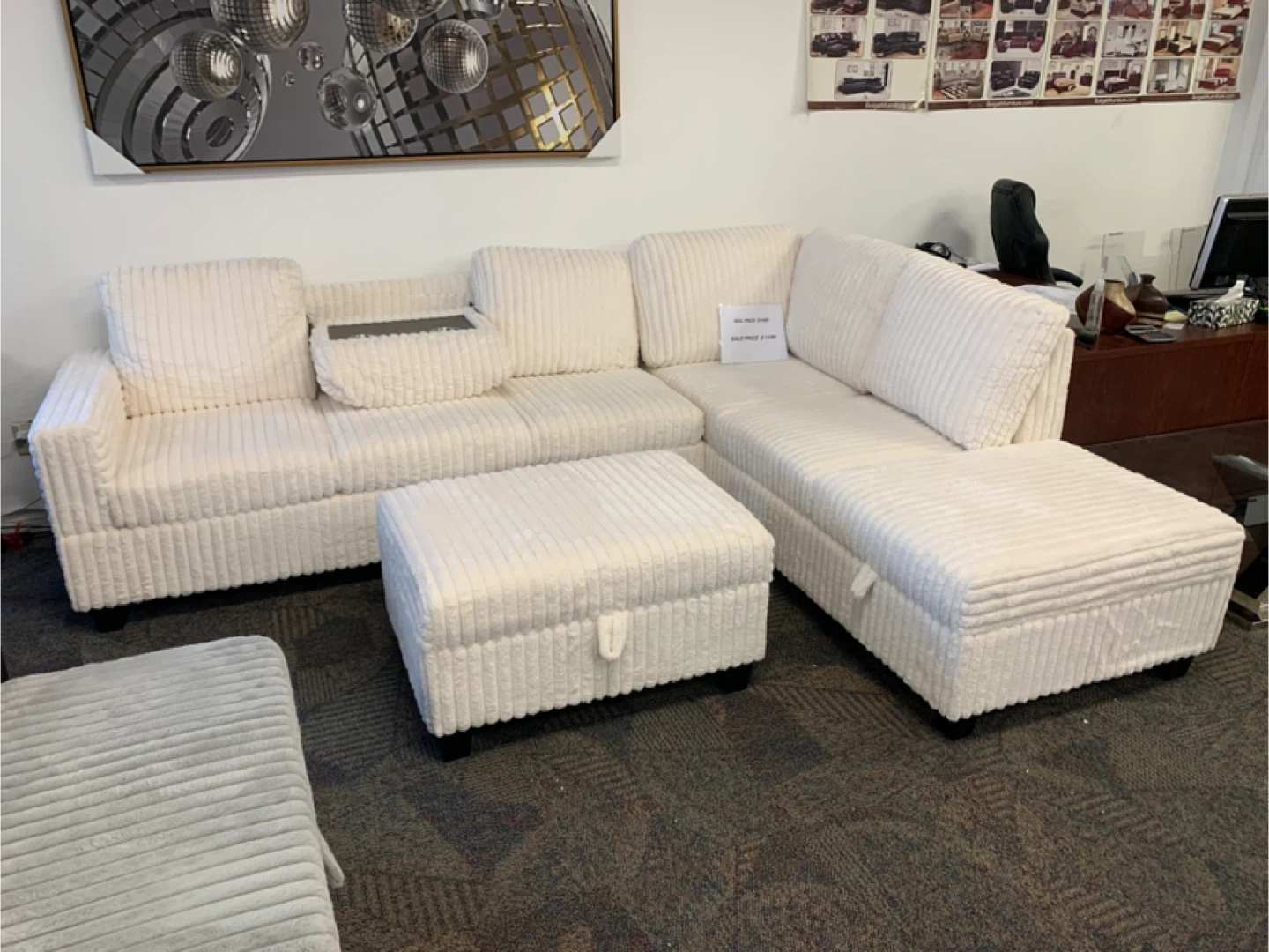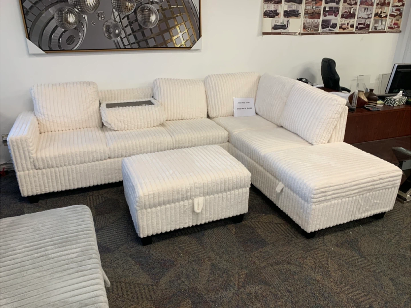 Cream Corduroy Sectional Sofa with storage Ottoman