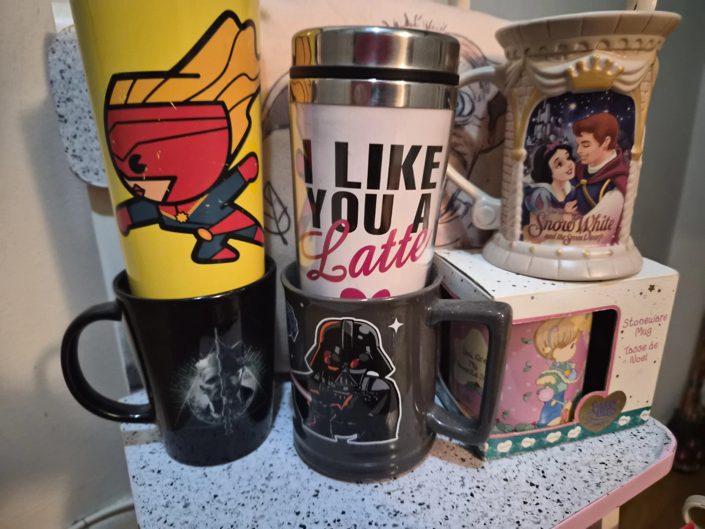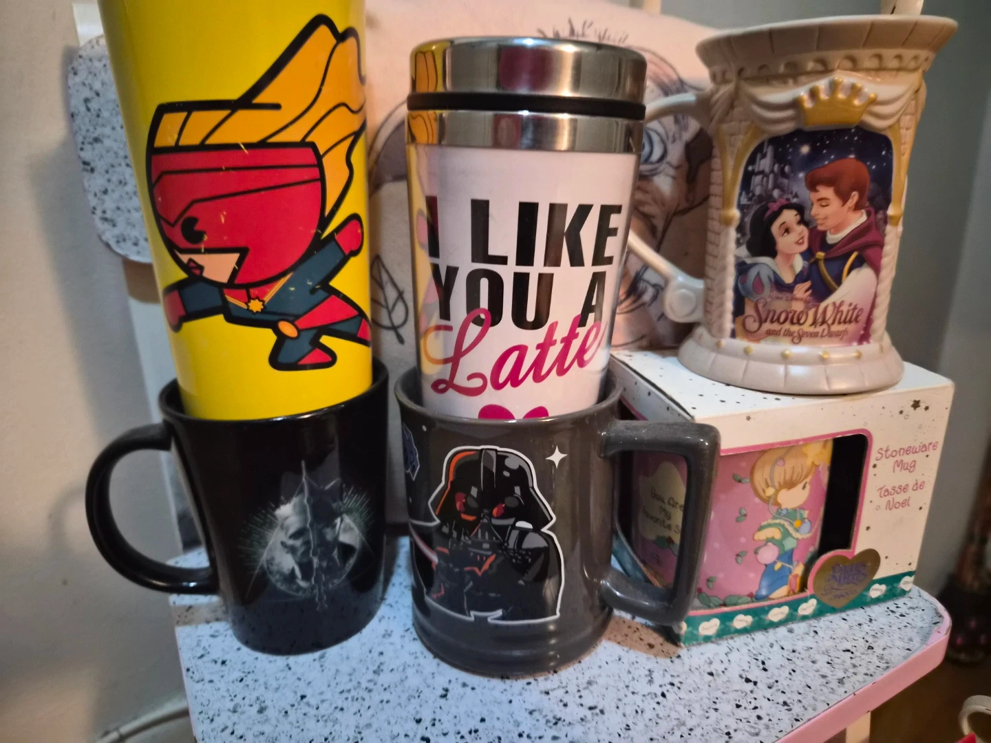 I have a variety of character mugs for sale! There's a Captain Marvel mug, a mug that says 'I Like You A Latte', a Snow White mug, a Darth Vader mug, and a Precious Moments mug. They are all in good condition to like new condition