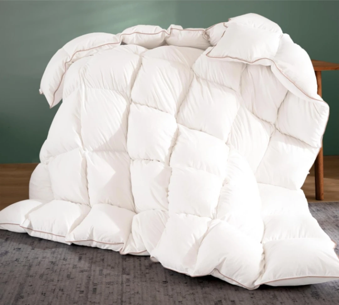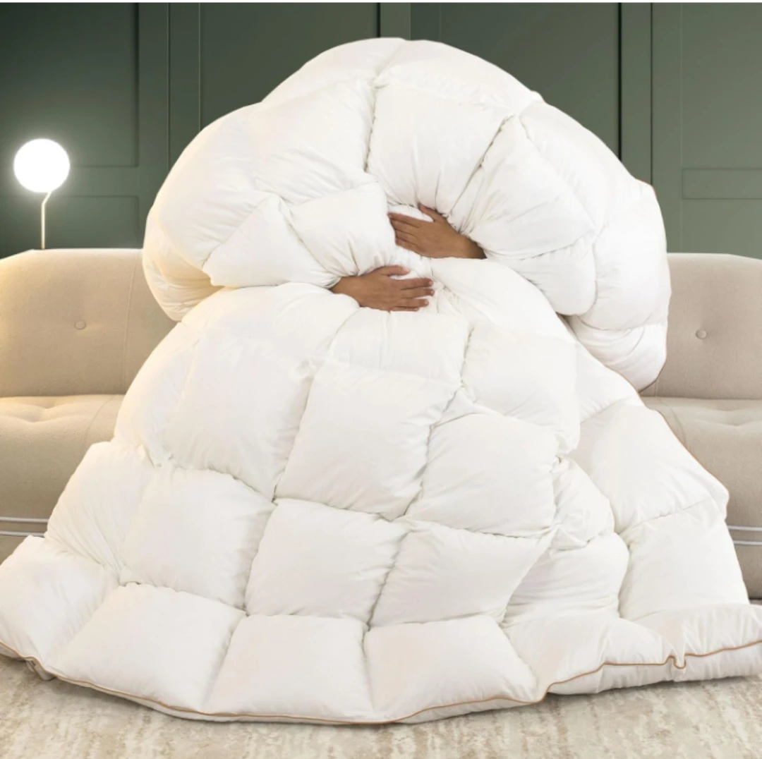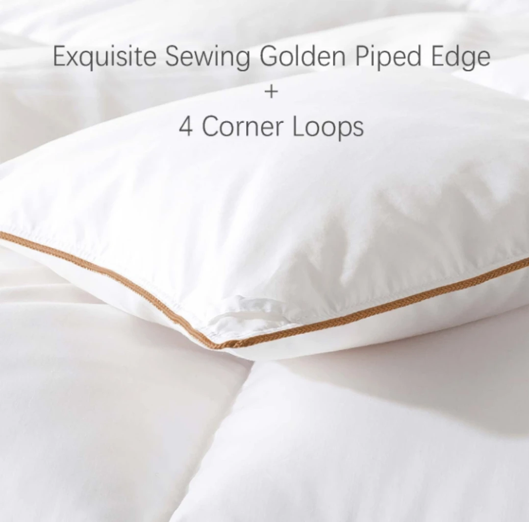 Selling a cozy white down comforter! It features a brushed 100% cotton fabric for extra comfort. Also has exquisite sewing with a golden piped edge and 4 corner loops.
