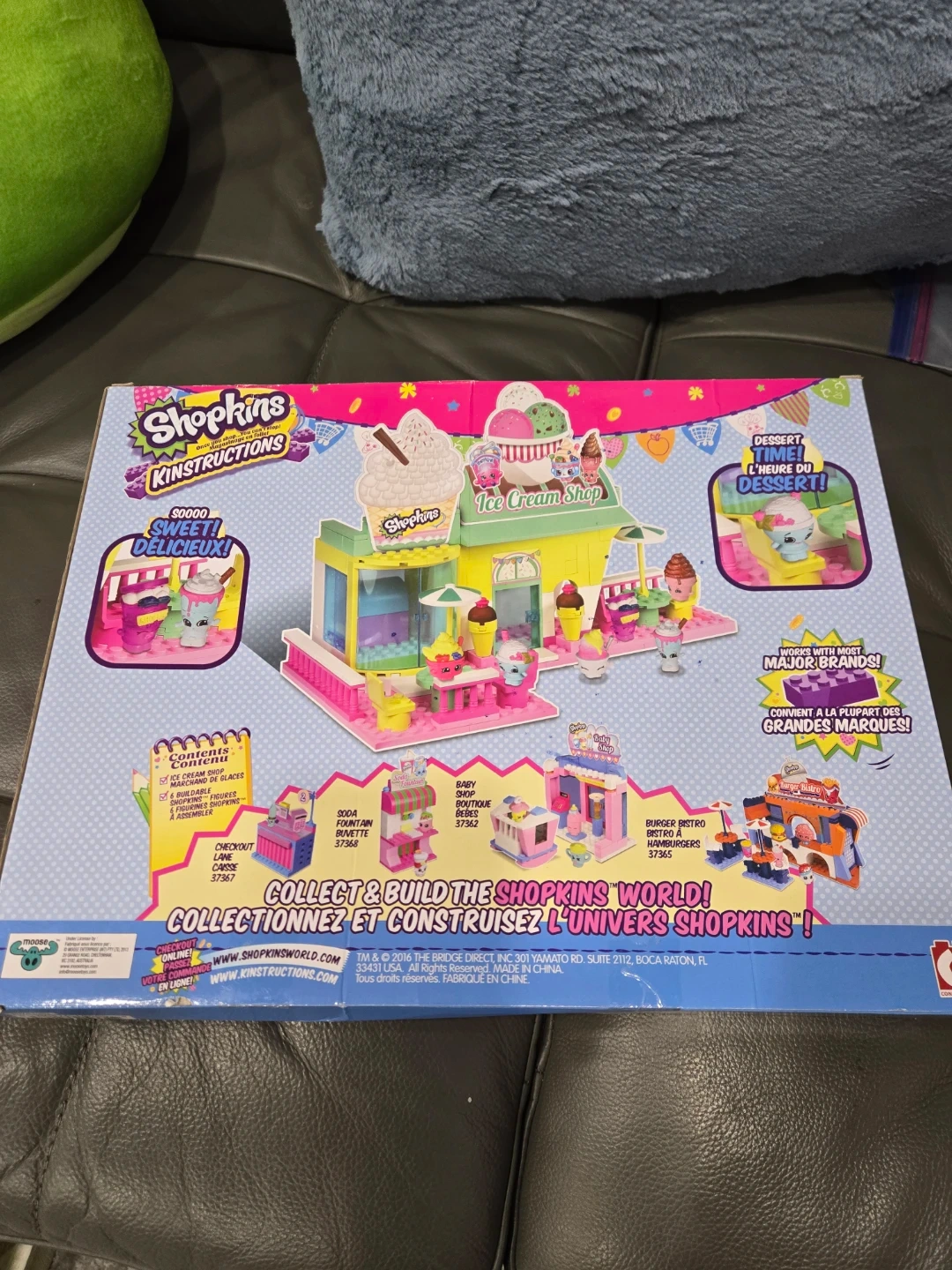 Selling a Shopkins Kinstructions Ice Cream Shop set! It's a buildable playset with lots of cute details. Great for kids aged 6+ who love Shopkins and building toys. Comes with 185 pieces to build your own Shopkins world