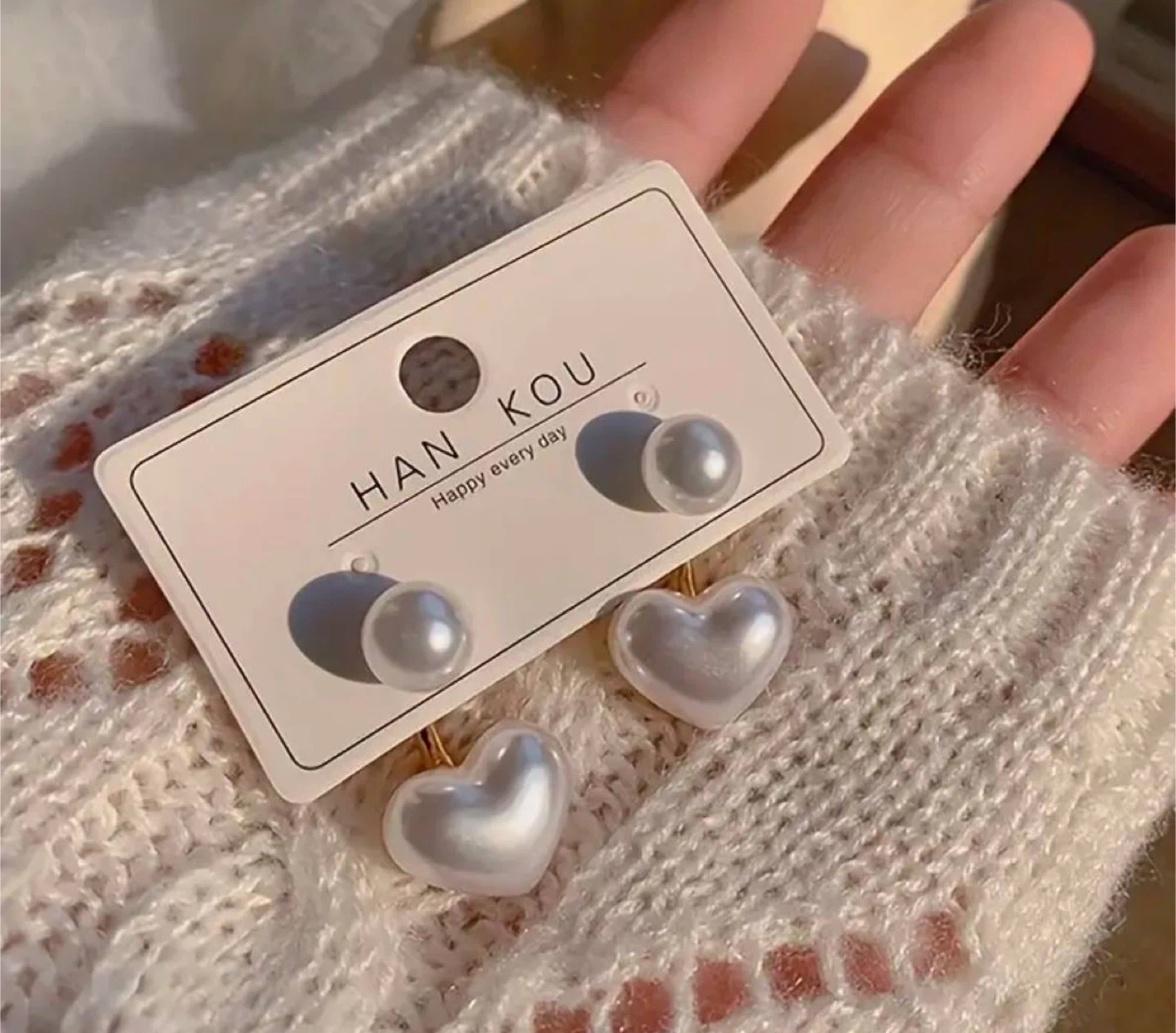Elegant double stud earrings. Features a pearl and heart design. Perfect for everyday wear or a special occasion. Lightweight and comfortable