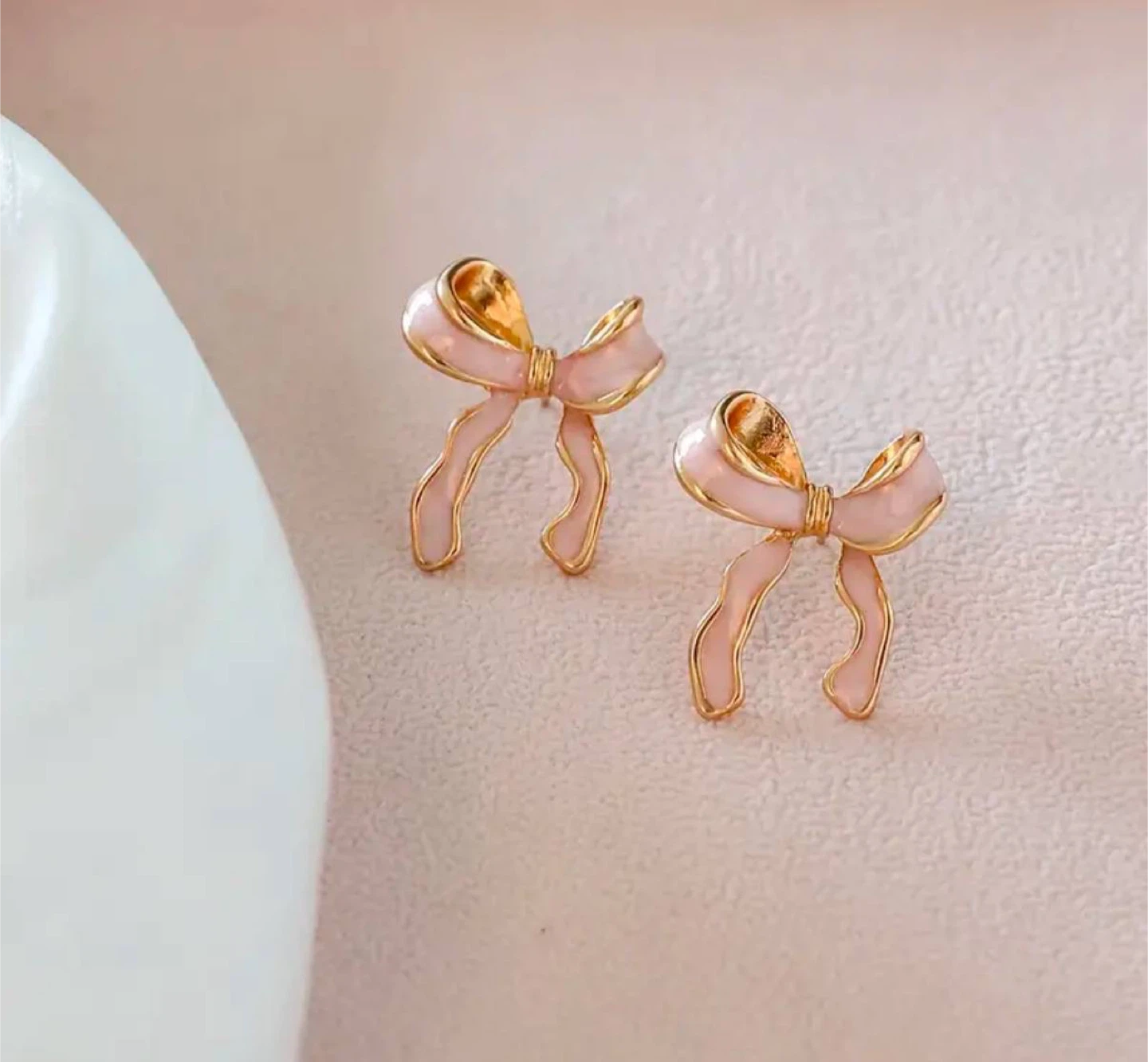 Cute pink bow-shaped stud earrings. Gold-toned metal. Perfect for adding a touch of elegance to any outfit. Lightweight and comfortable to wear.
