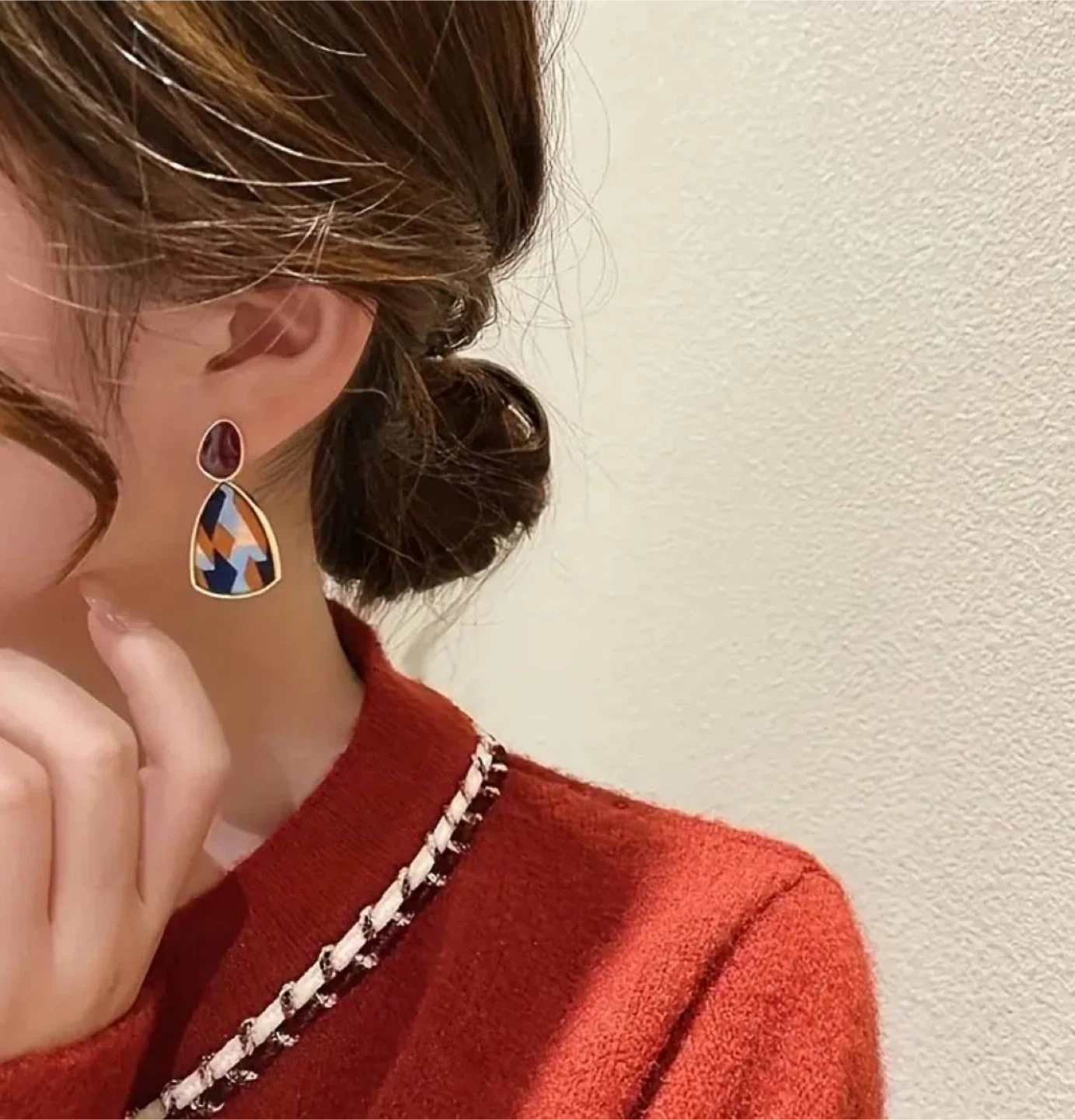Unique statement earrings. Features a geometric pattern and a dark reddish-brown accent. Gold-toned metal accents. Lightweight and comfortable