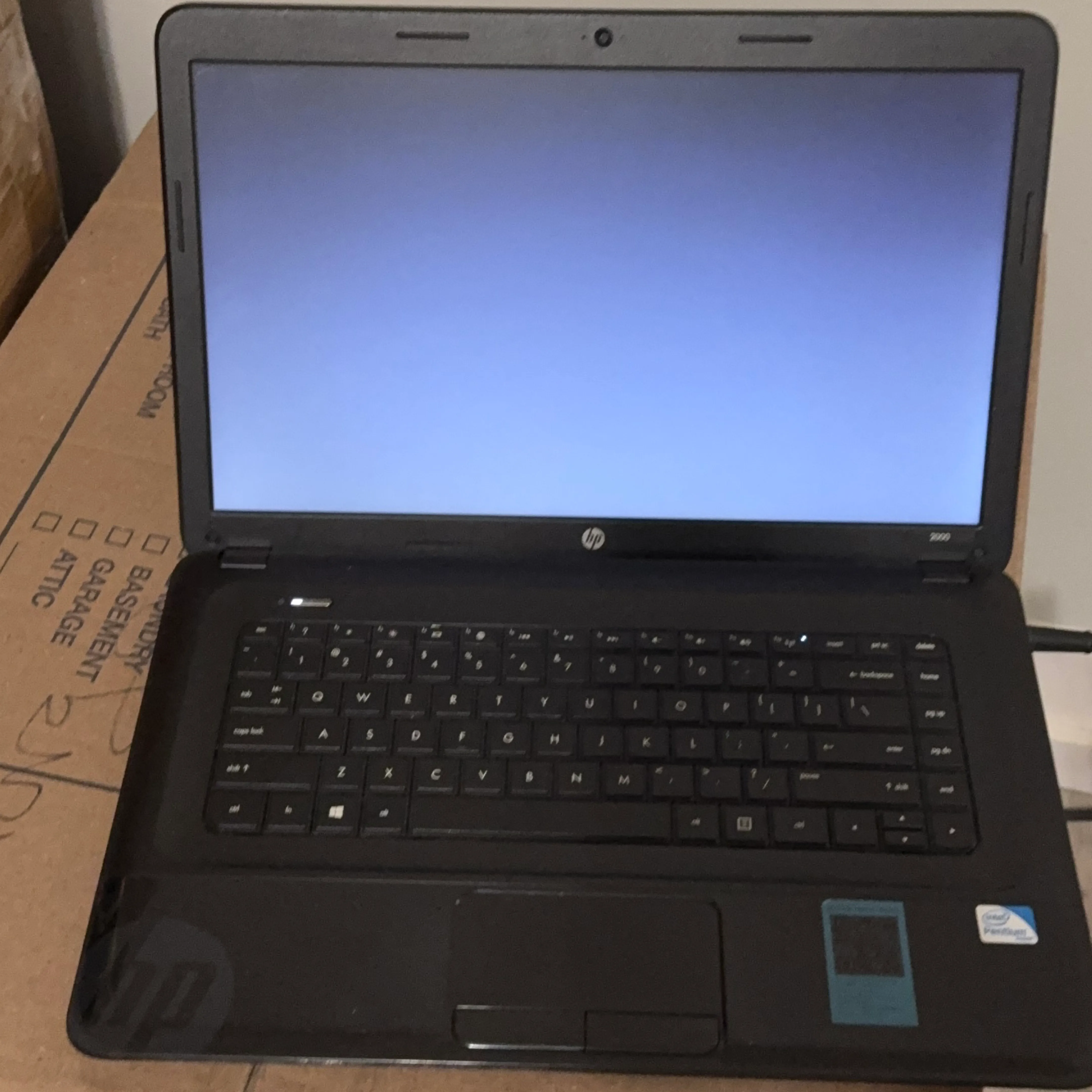 Selling an HP 2000 laptop. It has a black finish and the keyboard is in good shape. The Intel Pentium sticker is visible. Feel free to reach out if you have any questions! Needs updates only !