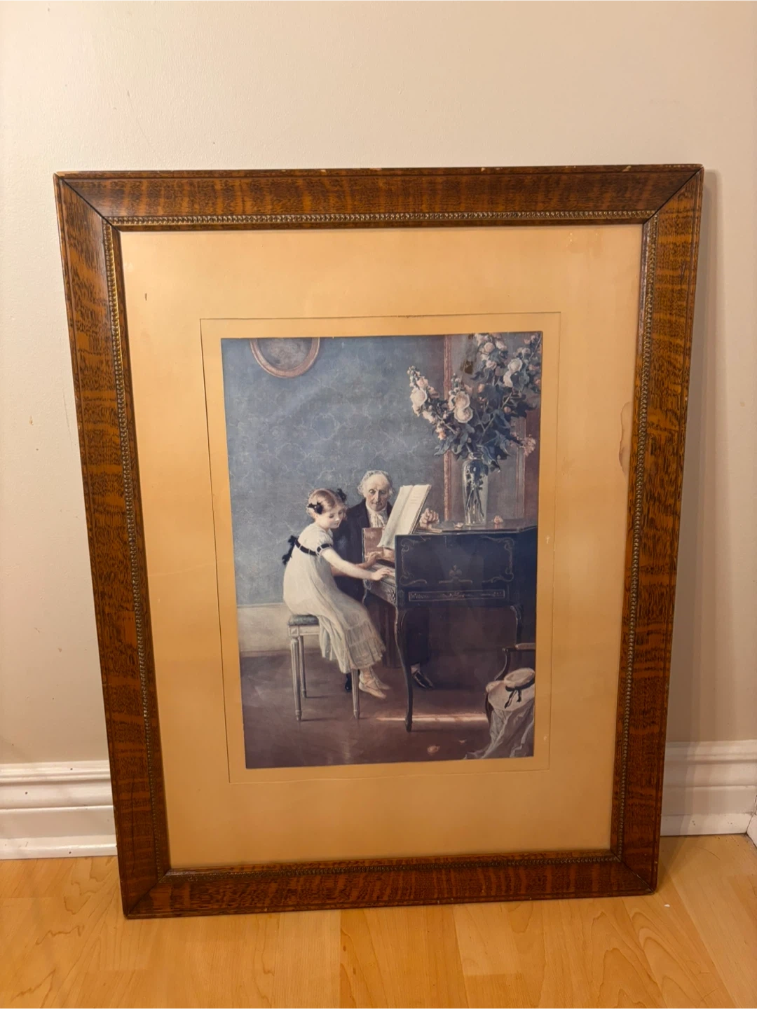 $50 or best offer - Beautiful large framed art print depicting a timeless interior scene of a young girl at the piano with her instructor. Soft, muted tones and traditional styling make this a perfect piece for classic, vintage, or European-inspired interiors.