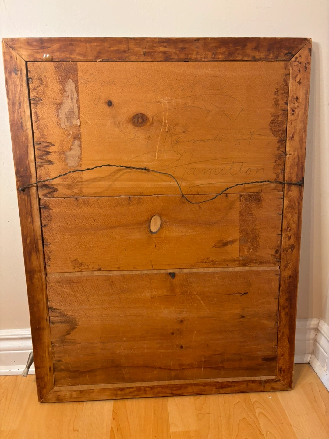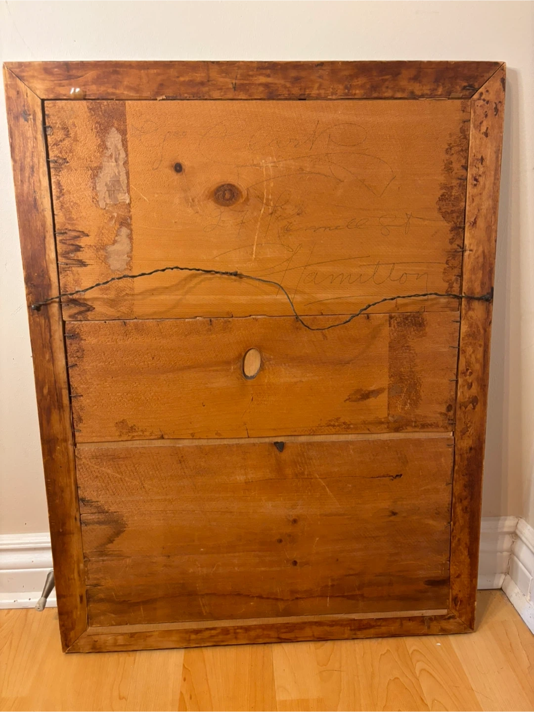 The artwork is housed in a solid wood frame with natural patina and age, giving it real character and warmth. Frame shows authentic wear consistent with age, adding to its vintage charm.
