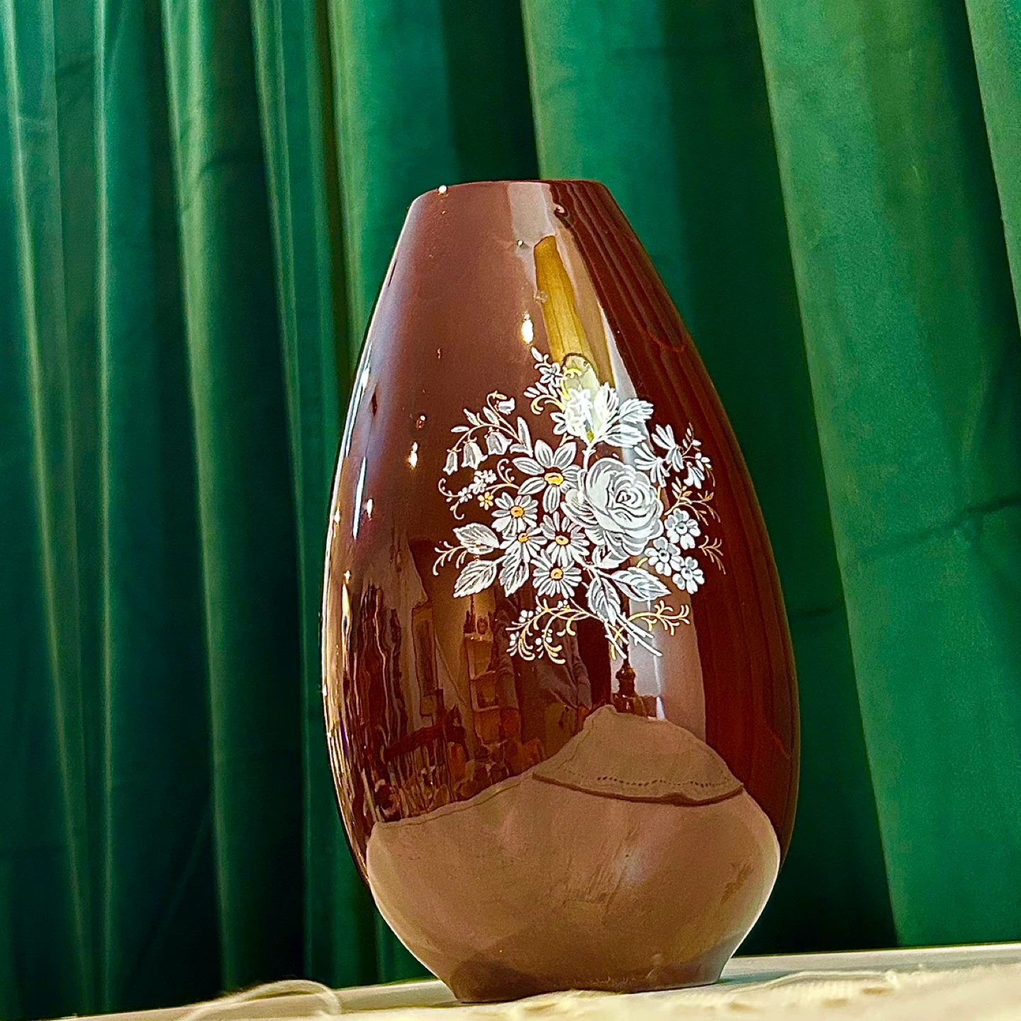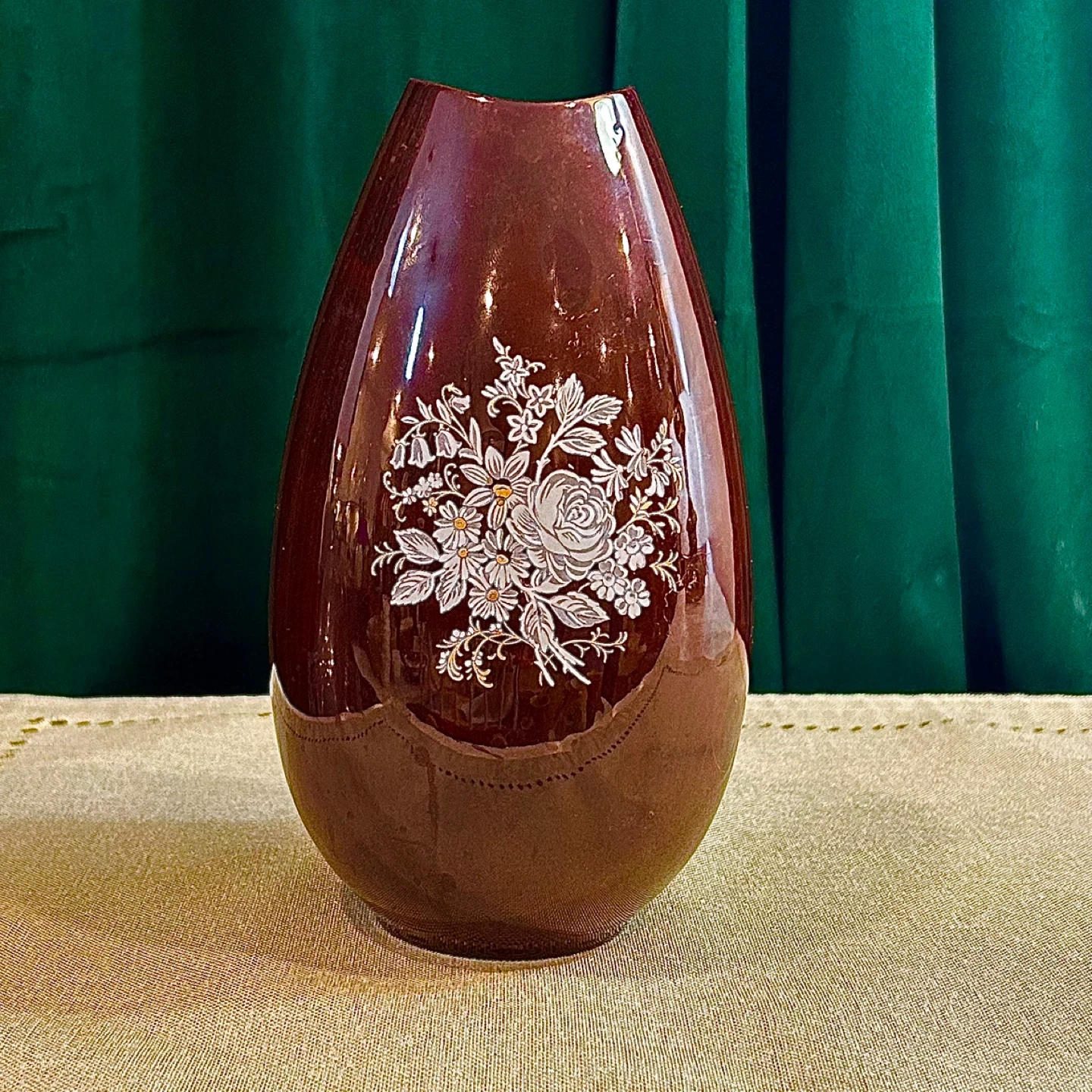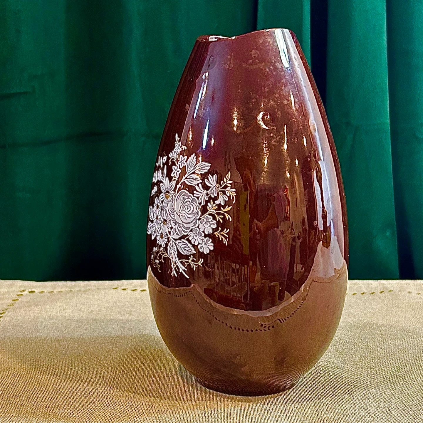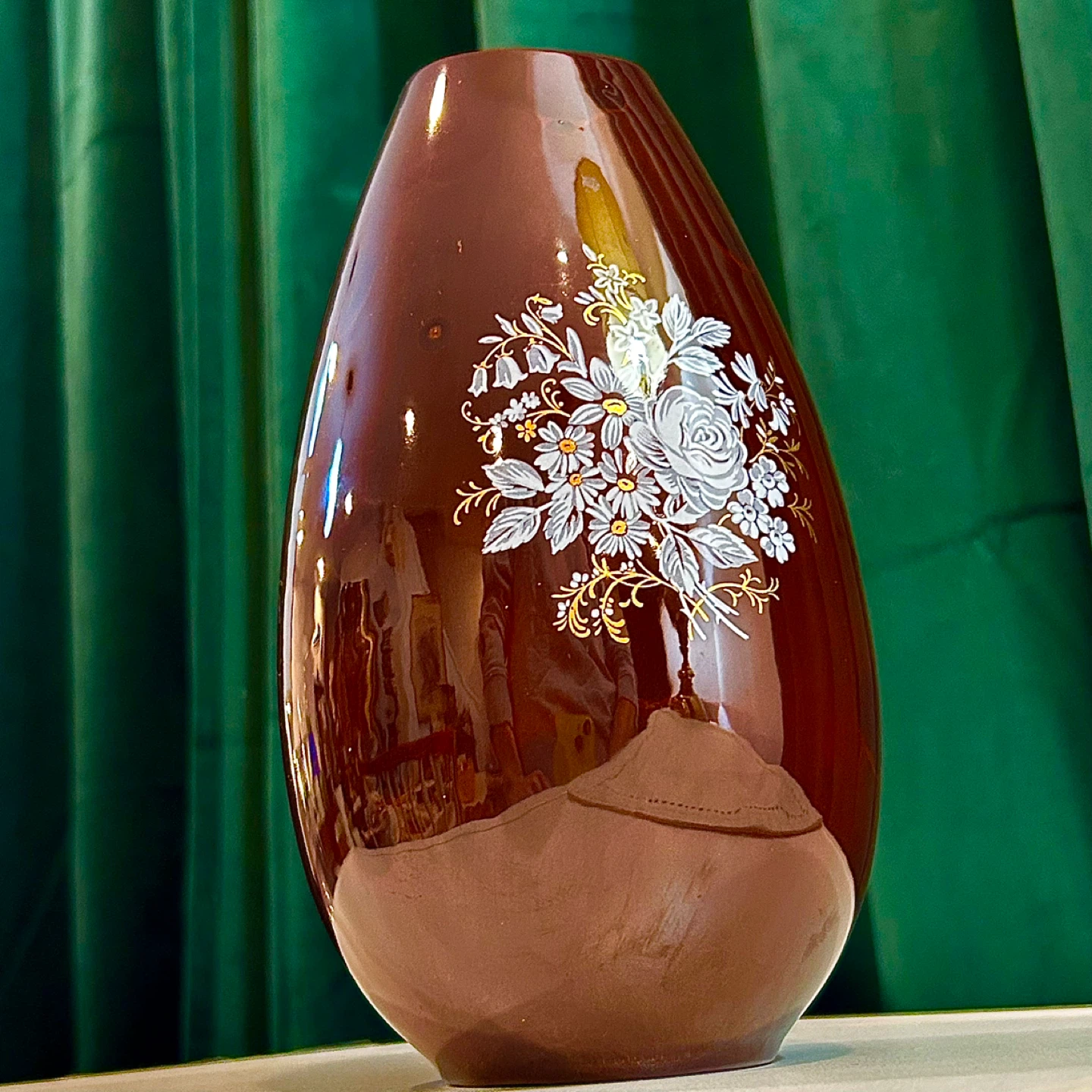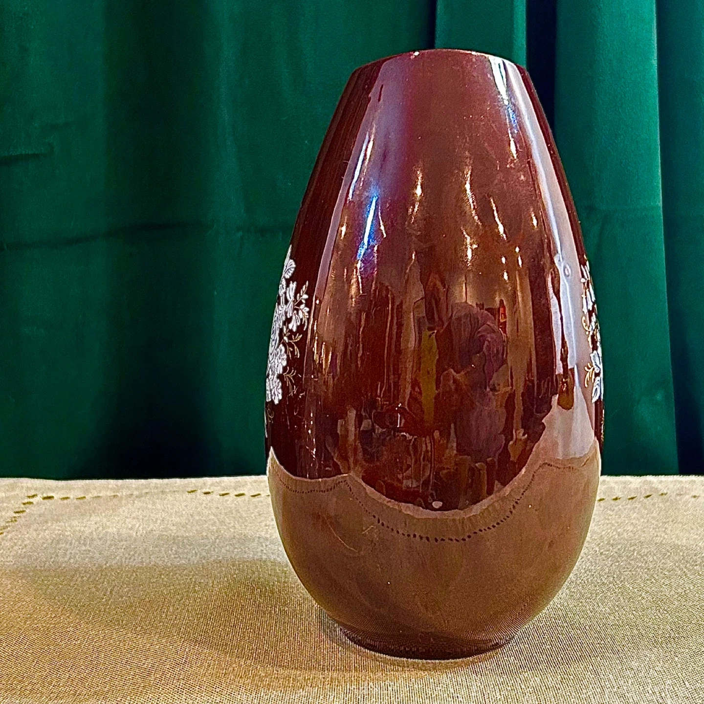 Offered here is an exceptional signed Sharon art pottery vase, a striking example of mid-20th-century American studio ceramics. This piece features a rich high-gloss oxblood / chocolate brown glaze contrasted with a hand-painted white floral bouquet accented in soft gold, executed in a refined, traditional decorative style.