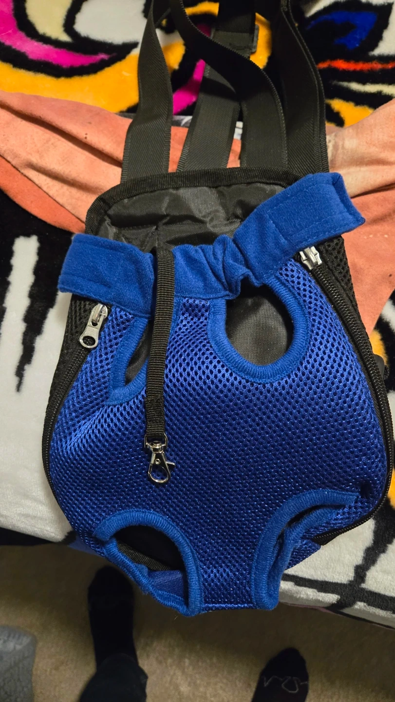 Looking to sell this blue pet carrier backpack. It's perfect for taking your furry friend on adventures! It features a mesh design for breathability and a comfortable fit for your pet