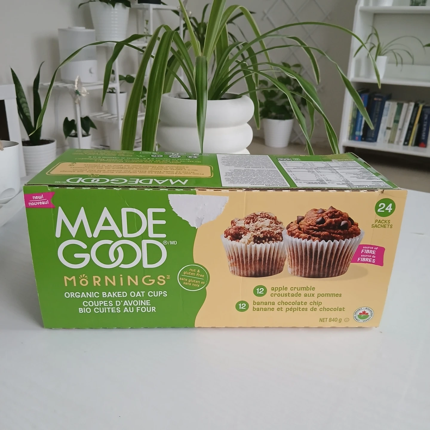 Selling a box of MadeGood Mornings Organic Baked Oat Cups. It contains 20 packs with apple crumble and banana chocolate chip flavours. Perfect for a quick and tasty breakfast or snack!